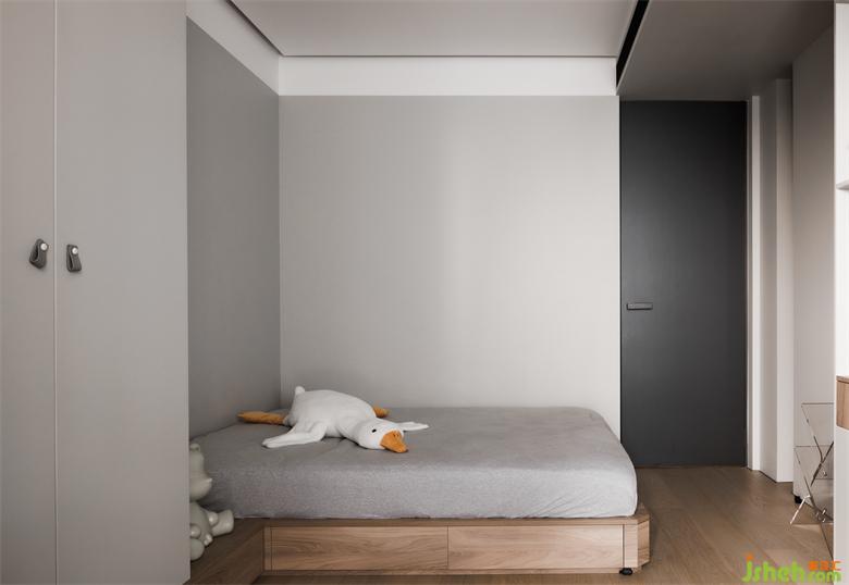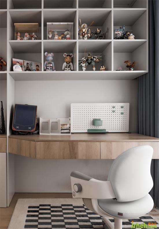 男孩房用灰色系打造,衣柜把手保留童趣。房間內(nèi)設置書桌以及開放式展示架,可以擺放一些小男孩喜歡的手辦或是書籍,家裝設計既能做展示,又能豐富收納空間。