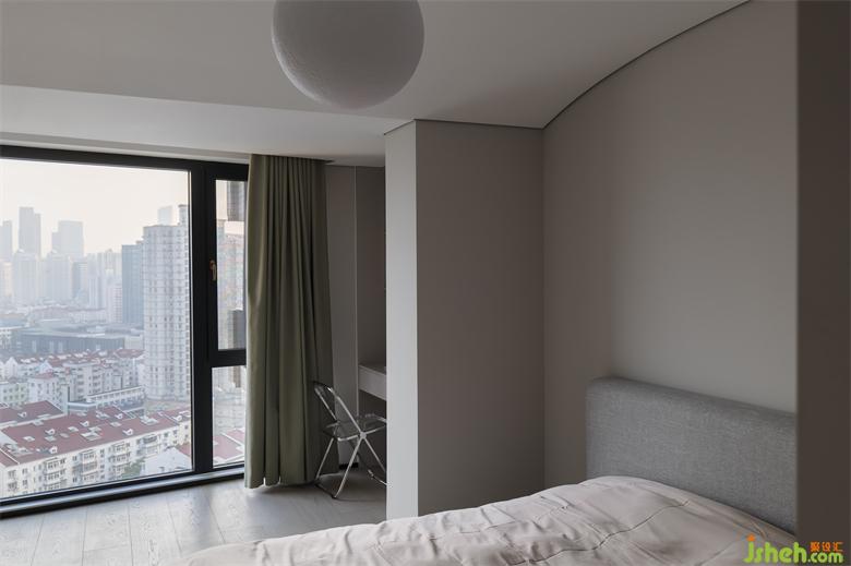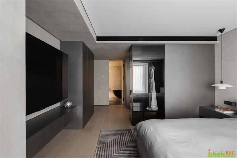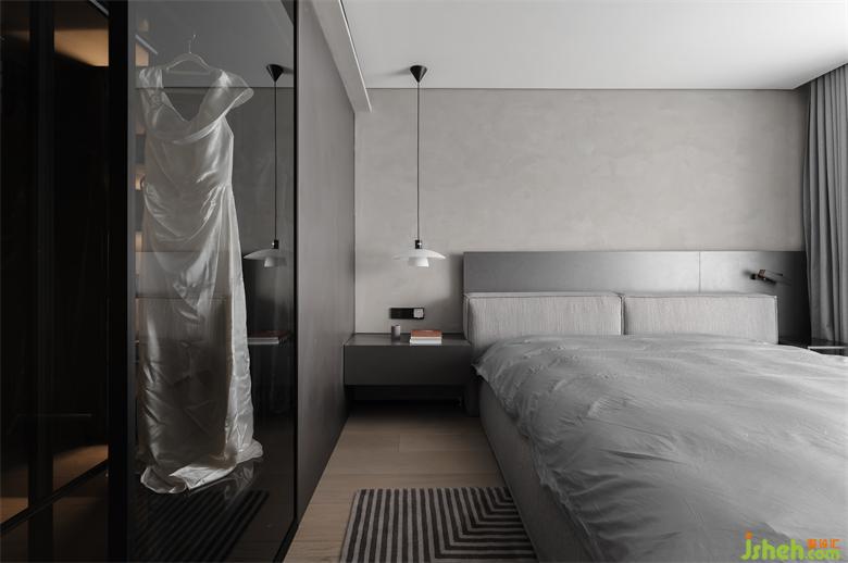 主臥套間在低調(diào)與時(shí)尚之間尋找平衡,是最具溫度與儀式感的存在。家裝設(shè)計(jì)進(jìn)入主臥就能看到設(shè)計(jì)別致的開放式U型衣帽間,一件高定禮服懸掛于黑色透明區(qū),高級(jí)感油然而生。定制的 Ditre Italia 床,床背板連接一側(cè)床頭柜,在上面安裝一盞床頭燈,在低飽和度灰調(diào)的鋪敘下,帶來了微妙而柔和的空間敘述。