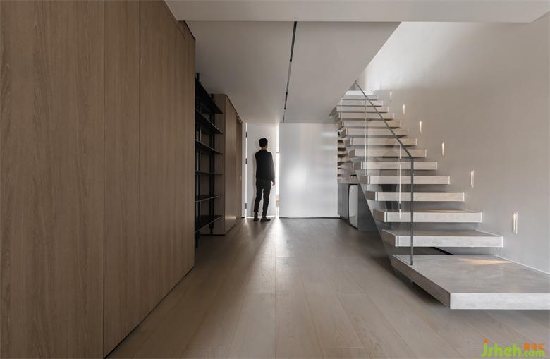 一層空間全部采用隱形門設(shè)計(jì),顏值與高級(jí)共存,放大空間的同時(shí)讓家在視覺上整體性更強(qiáng),也可以讓家中仿佛多出來一個(gè)“秘密”空間,讓空間充滿趣味。樓梯采用鋼架結(jié)構(gòu),上附木板,扶手則采用玻璃材質(zhì),踏步間的縫隙與玻璃的透明感保持了視覺上的純凈大氣。感應(yīng)腳燈也給予了上下樓足夠的光源與安全感。