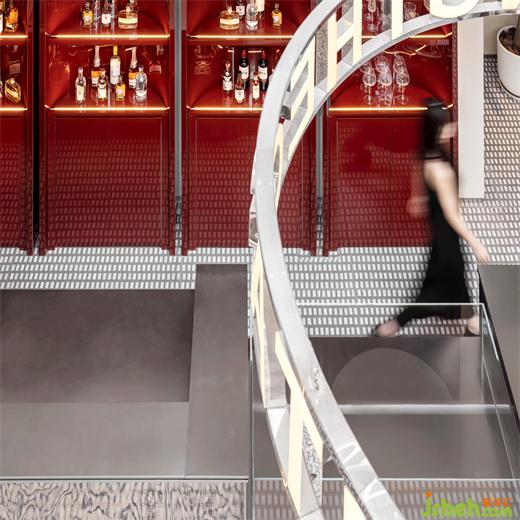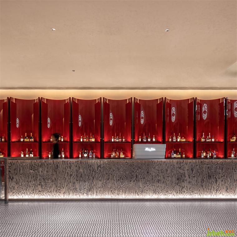 作為楊浦工業(yè)銹帶中最具特色的元素,“聯排筒倉”被以刨切的形式抽象化為空間中的城市記憶雕塑,海上和集設計并成為接待區(qū)和水吧區(qū)的超級符號。