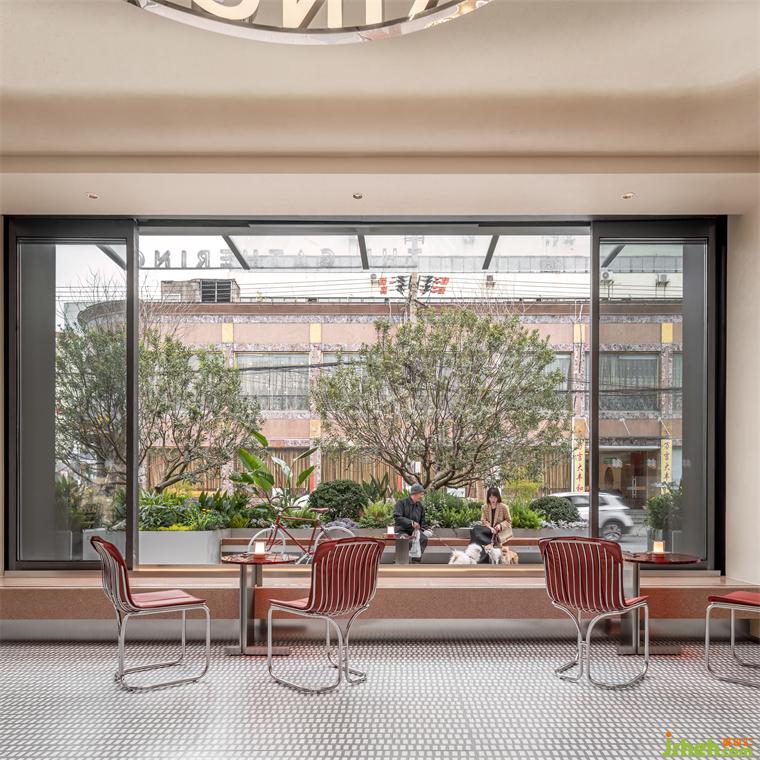 舊建筑的立面與海上和集建筑的開放式立面也展開了新舊對話。海上和集設計擴寬且?guī)в谢壍拇把厝菁{、伴隨并定義了鄰里可以以任何偶然的行為與空間與街道雙向互動??汕度胲壍雷杂梢苿拥倪呑溃b修公司采用銀色的時尚工業(yè)風格搭配簡約的紅色圓形玻璃桌面,成為街道的活力元素。