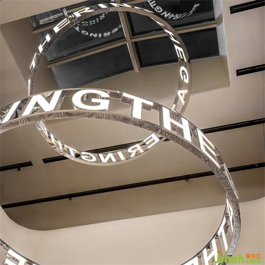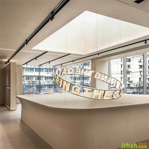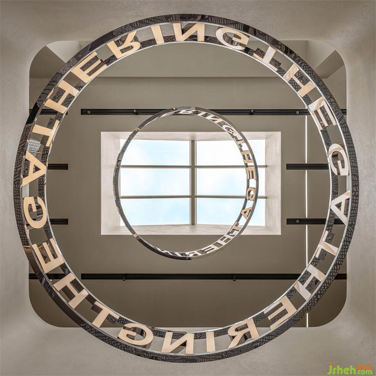 設計師在一層和二層之間創(chuàng)建了一個和樓板一體的曲面扶手作為聯(lián)通,海上和集設計像是一個工業(yè)煙囪穿插在樓板之間。巨大的燈光裝置則猶如工業(yè)作業(yè)中白煙,以螺旋形飄向天空,而風塑造了燈的造型,輕輕搖曳,宛如天和地、歷史與未來的連接體。