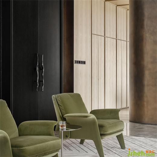 一旁的Meridiani茶幾,圓形鏡面與復(fù)古黃銅圍邊,私人別墅裝修設(shè)計(jì)自帶歷久彌新的優(yōu)雅氣息。與之相對(duì)的一雙Minotti綠色調(diào)座椅,微微向外翻轉(zhuǎn)的扶手設(shè)計(jì),提供了更為休閑的愜意與舒適。