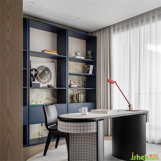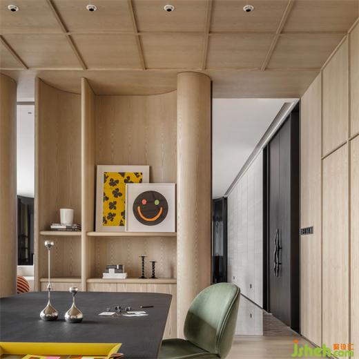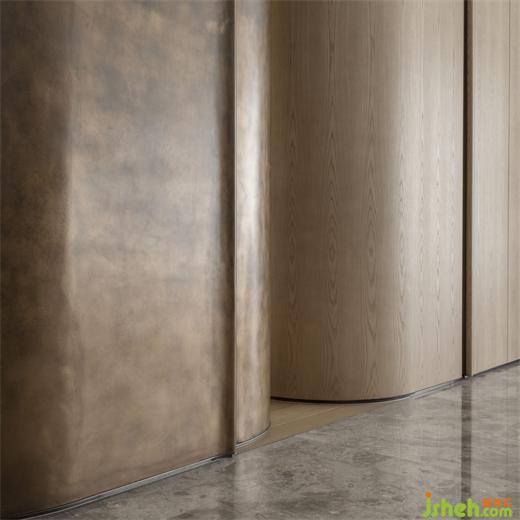 細(xì)致的家宅空間,如音樂般富有節(jié)奏韻律,有聚合之地更有靜處方所。在休閑區(qū)與茶室之間,私人別墅裝修設(shè)計(jì)師插入藝術(shù)金屬體塊將兩個(gè)功能區(qū)分隔開來,圓弧之上,作有凹凸的線條,仿若雕塑,而體塊背面又兼具著書架的實(shí)用功能。