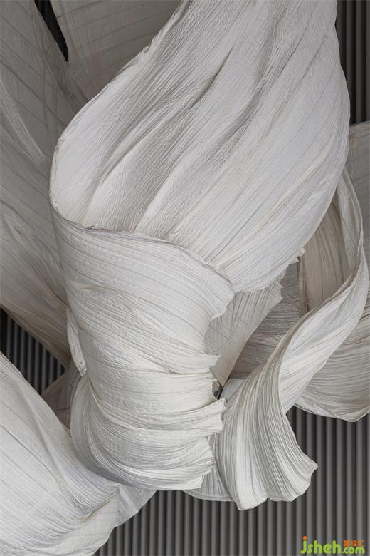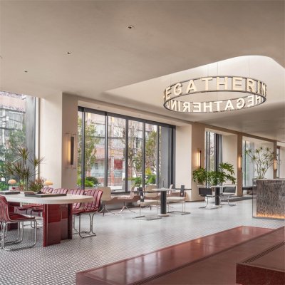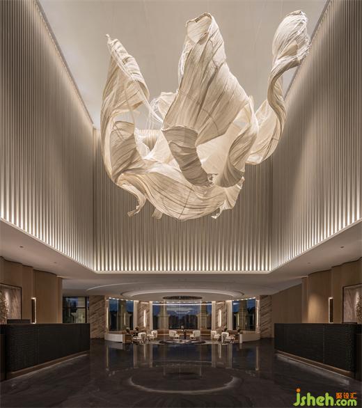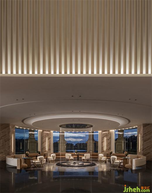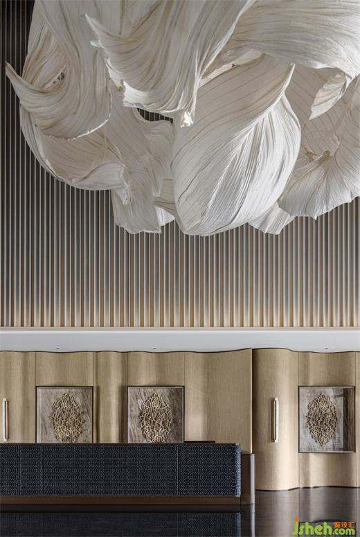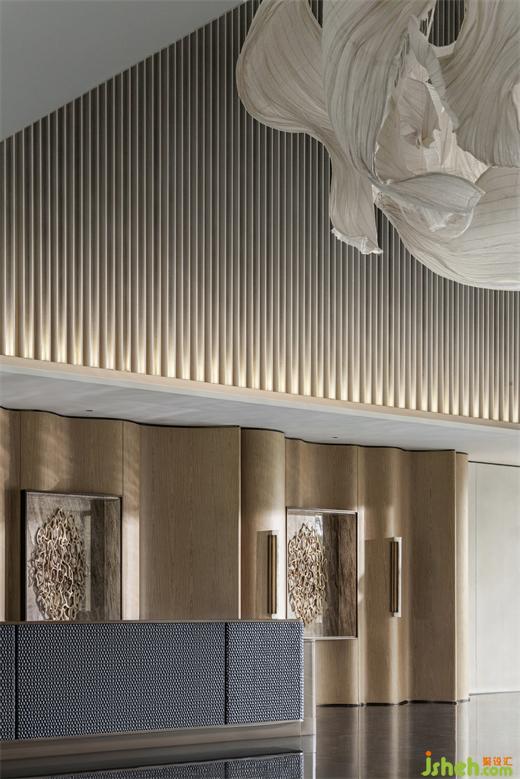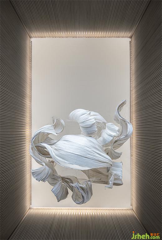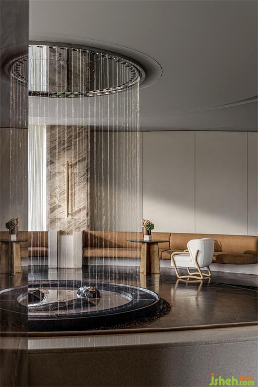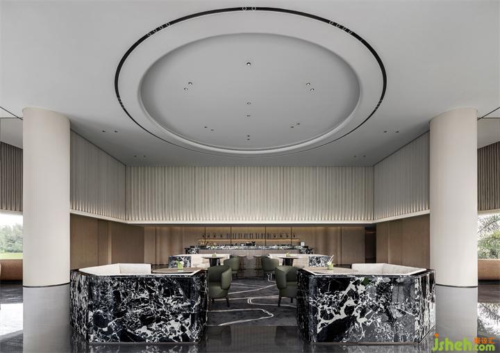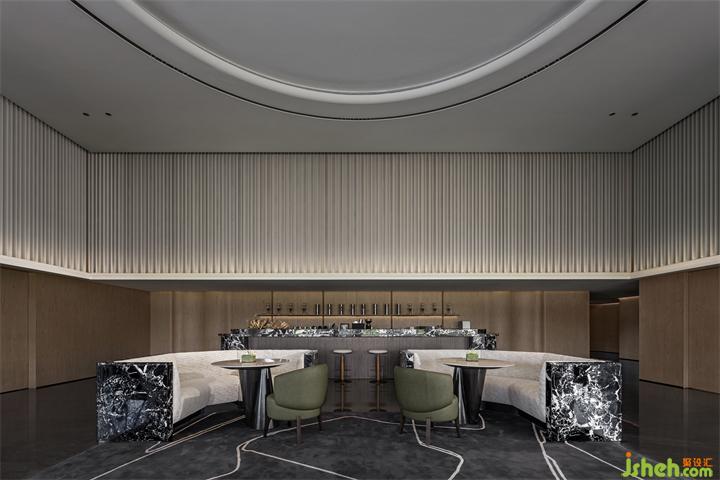 遵循原始空間的中軸對稱與環(huán)形形式,擒縱高爾夫運動的動態(tài)意向,MDO以拋物線為靈感,體驗中心設(shè)計將入口視作起點,將擊球后的高飛剎那定格于接待中心?!鹅F嶼》裝置幻化出超然于任意球體的清澈靈動。墻體的立面曲率與懸掛的裝置曲率相平衡。墻壁的雕塑性、延展性,為空間帶來了更為軟性和流動的感官體驗,與地面石材的堅固物質(zhì)性形成鮮明對比。裝修設(shè)計