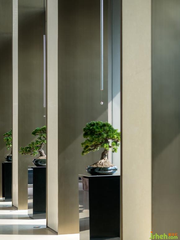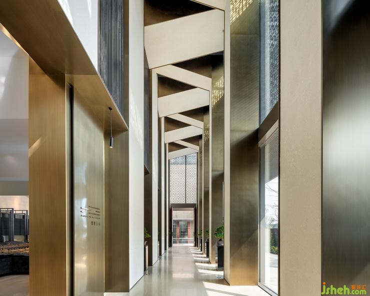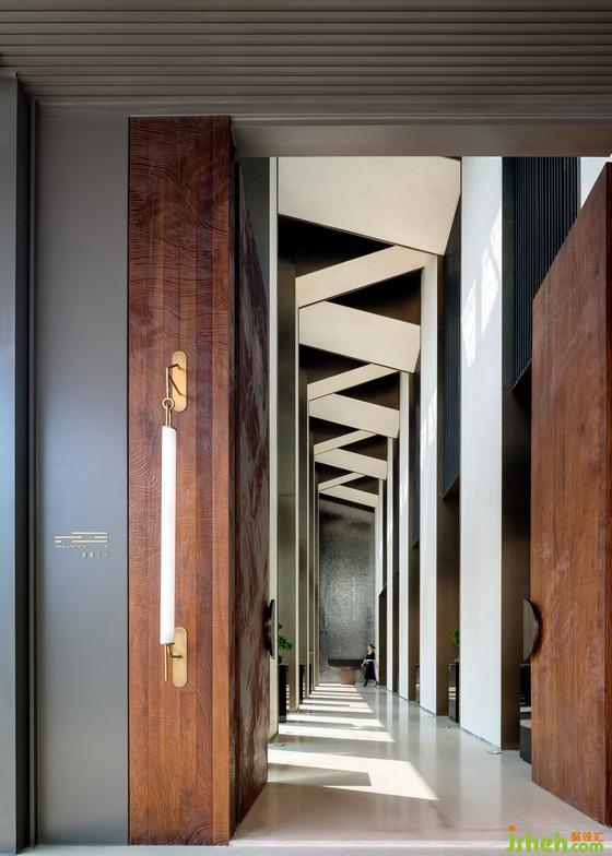 我們?cè)O(shè)計(jì)了一系列的折疊屋頂(靈感來源為中國藝術(shù)家吳冠中作品中展現(xiàn)的傳統(tǒng)中式屋頂),而這些屋頂形狀也呼應(yīng)了建筑的節(jié)奏。這個(gè)長廊從南邊單側(cè)采光,這種節(jié)奏被一系列的立柱上深色拉絲金屬與淺色砂巖之間的強(qiáng)烈對(duì)比凸顯得更加強(qiáng)烈。每兩個(gè)立柱之間都給予訪客一個(gè)通過層疊的屏風(fēng)瞥見室內(nèi)的機(jī)會(huì)。