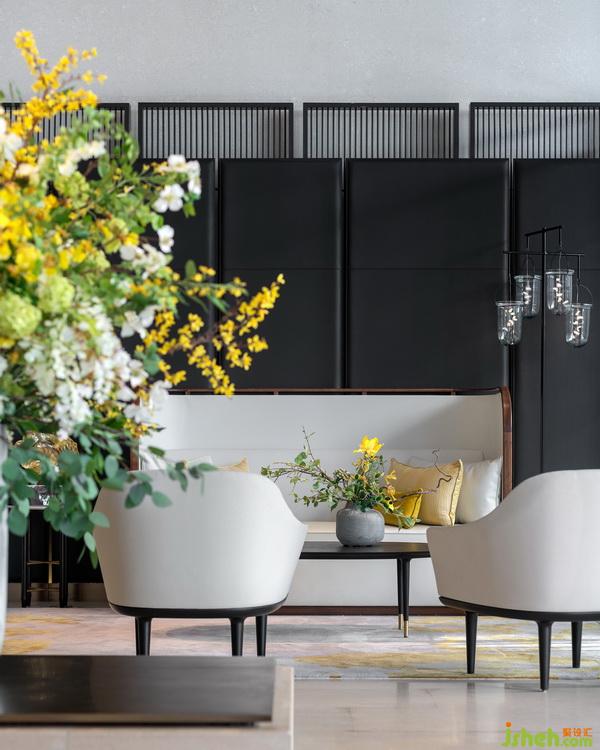 我們?cè)O(shè)計(jì)了洽談區(qū)處的定制沙發(fā),這個(gè)沙發(fā)也呼應(yīng)了觀看室外景觀的視角。背靠著墻的沙發(fā)有一個(gè)很高的后背,給你提供了必要的隱私。而面朝景觀的沙發(fā)則比較矮,能給訪客提供朝向花園和景觀的極佳視角。