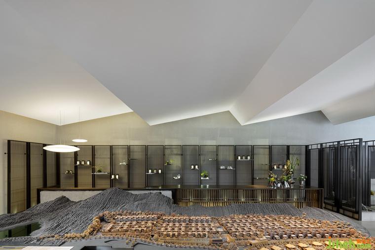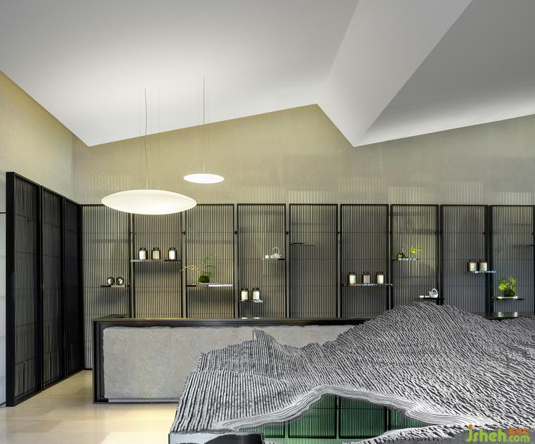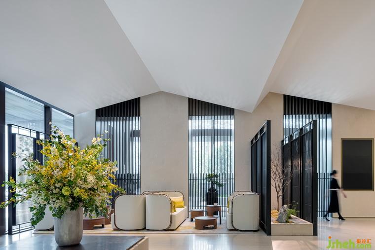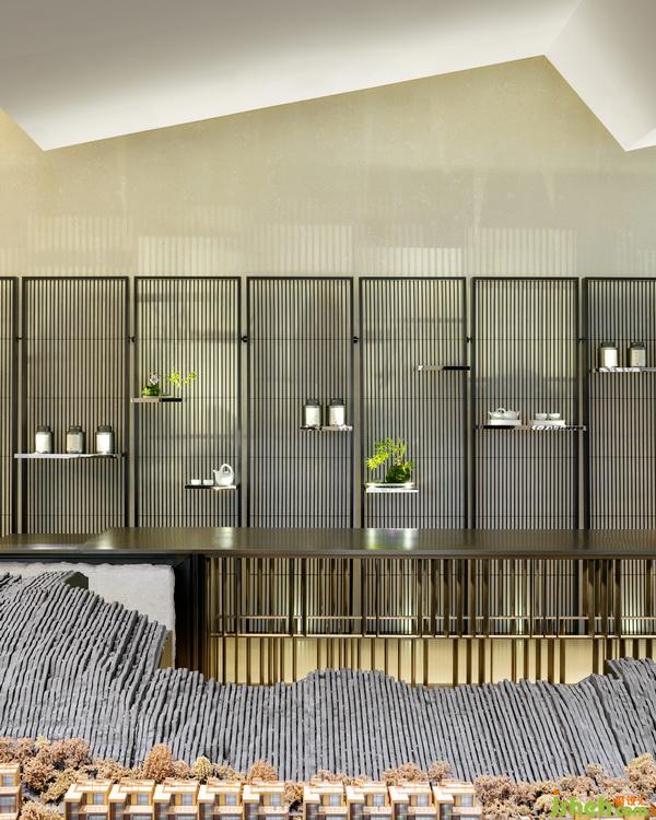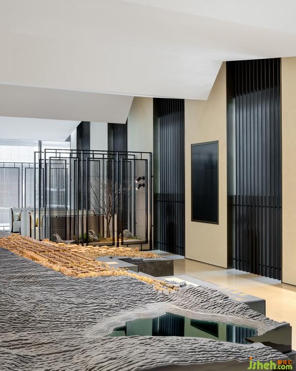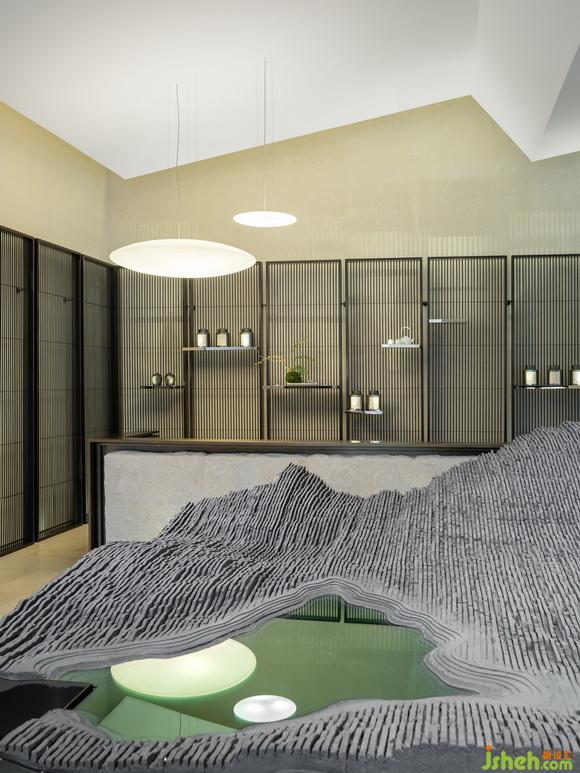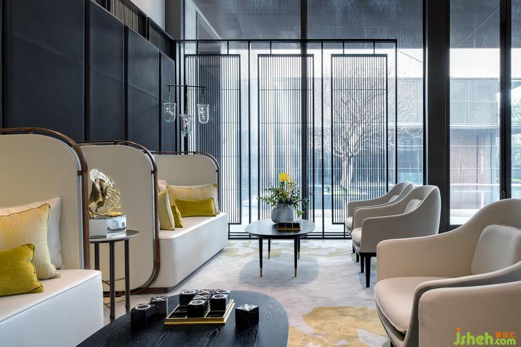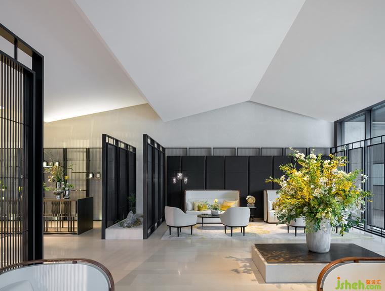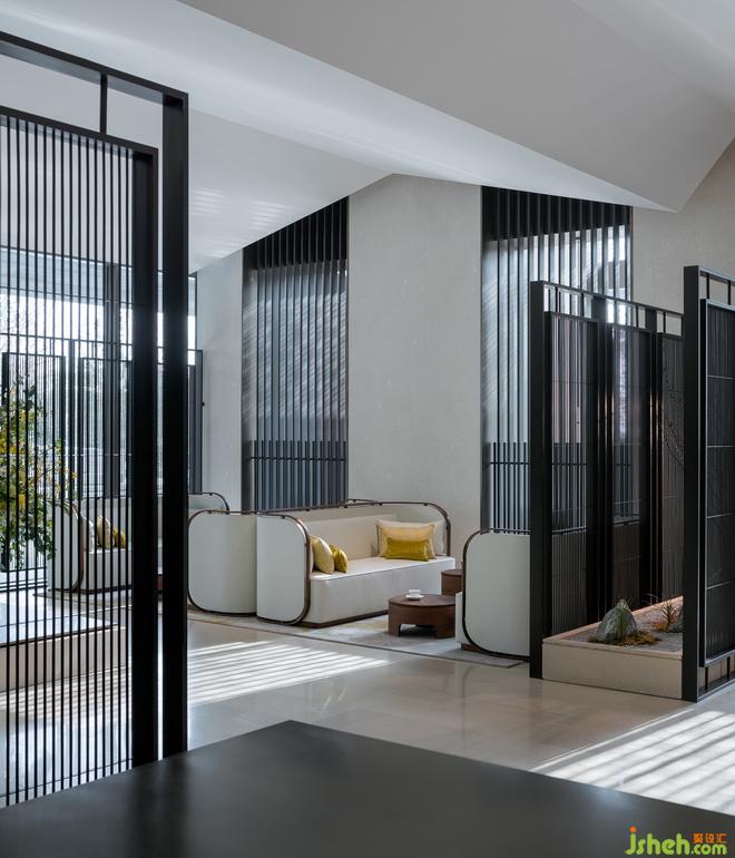 在中央?yún)^(qū)域的中心部位有一個用烤漆屏風圍繞起來的微景觀。這個微景觀把室外的風景延續(xù)到了室內,既成為了一個室內特征,又增加了室內的層次感。