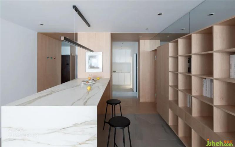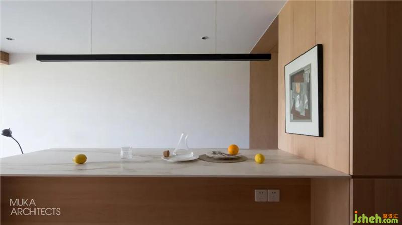 全屋唯一一處進口巖板。兼顧了餐桌、吧臺、看書工作、未來起居活動等一系列家庭核心功能的中心島臺,上海裝修設(shè)計即是視覺中心,與一號楓木盒子的完美銜接契合也形成了很好的洄游動線。