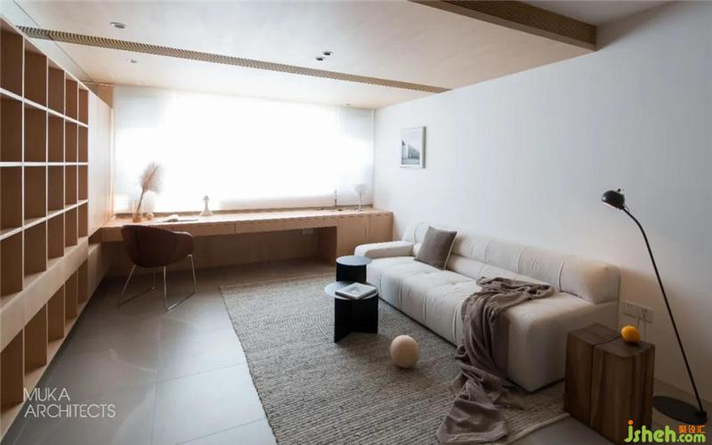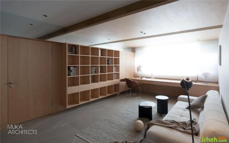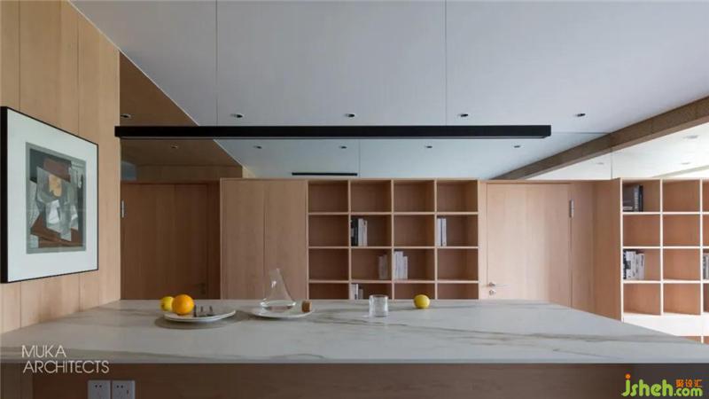 我們通過楓木飾面板與多層板現(xiàn)場制作家具,這五個楓木盒子的嵌入形成了諸如玄關(guān)收納、地臺收納、大書架、大書桌、一體化島臺等業(yè)主需要的全部使用功能框架上海裝修設(shè)計。