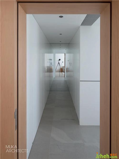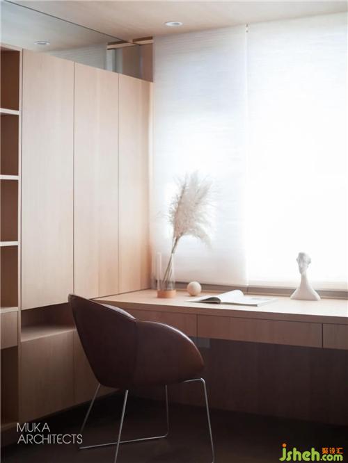 四號(hào)五號(hào)楓木盒子涵蓋了兩面懸浮大書(shū)架,之間通過(guò)連續(xù)的楓木飾面覆蓋,形成兩個(gè)隱形門(mén)分別通往主臥和榻榻米房。兩面懸空的書(shū)架共計(jì)50格,上海裝修設(shè)計(jì)五代表金木水火土五行,代表天地間萬(wàn)物構(gòu)成元素的極限數(shù),承載著兩位老師的文化底蘊(yùn),亦蘊(yùn)含著他們治學(xué)工作中的舉重若輕。