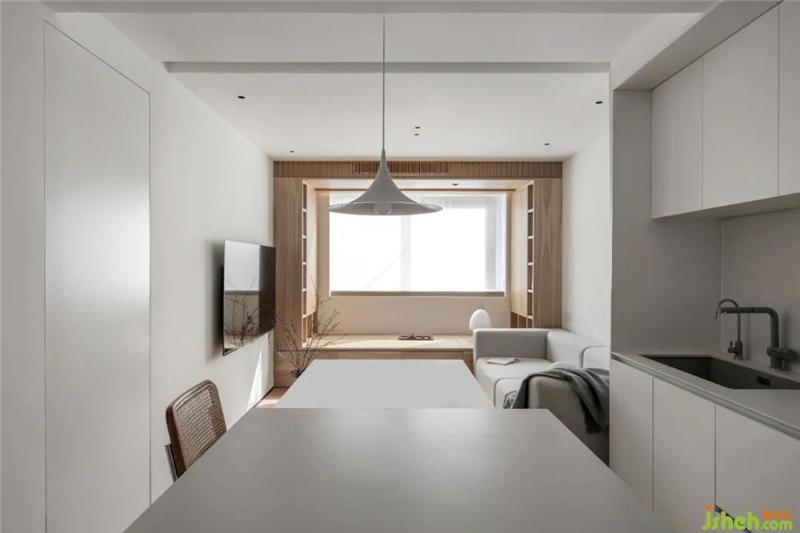 我們用白色暖灰加以木頭試圖營(yíng)造