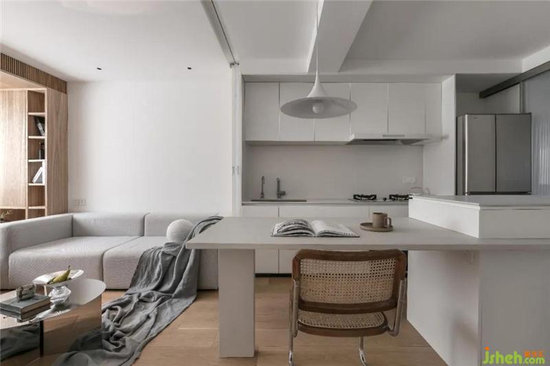 客廳內(nèi)開(kāi)放式廚房與島臺(tái)餐桌相結(jié)合,