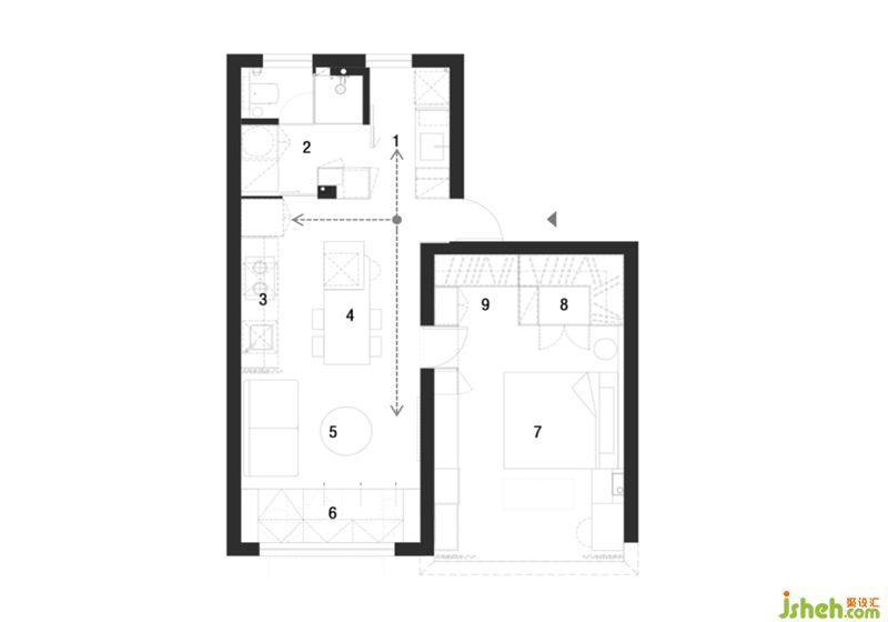 動(dòng)線三:下班回家進(jìn)入客廳或臥室休息。