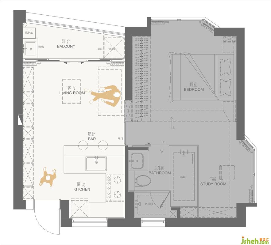 2、工作比較忙,很少在家做飯,可以接受開放式廚房,餐桌可以弱化改為吧臺,滿足就餐或者辦公的需求;