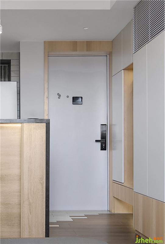 ▲玄關(guān)入戶門位置調(diào)整比例縮小,靠墻增加整面的收納柜,滿足海量收納需求;門口瓷磚和木地板的漸變過渡處理,方便清潔,還提升美感。室內(nèi)設(shè)計(jì)師