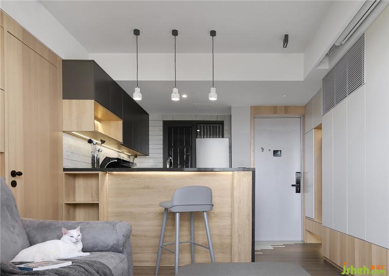 2、我們把廚房設(shè)計(jì)為開放式,吧臺和餐桌結(jié)合(很少做飯,平時(shí)都是點(diǎn)外賣)。