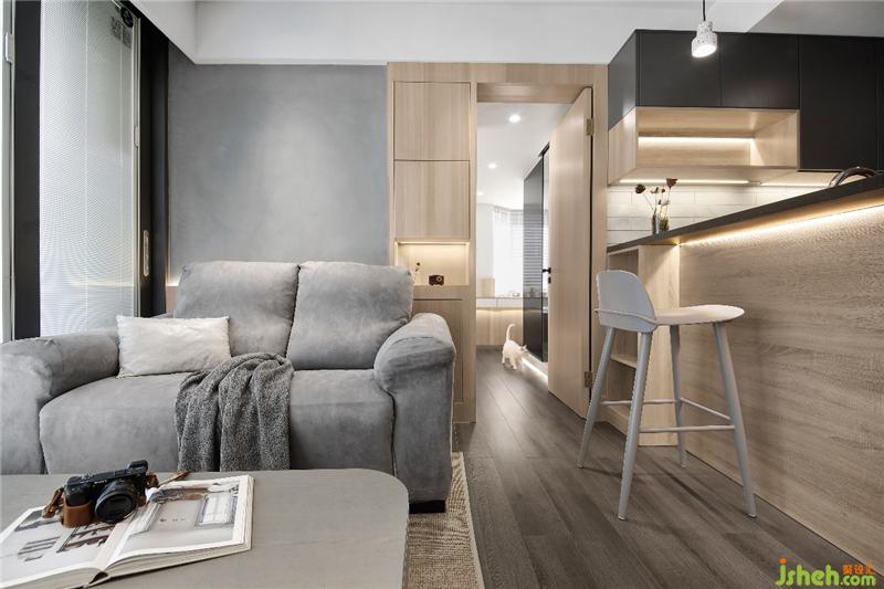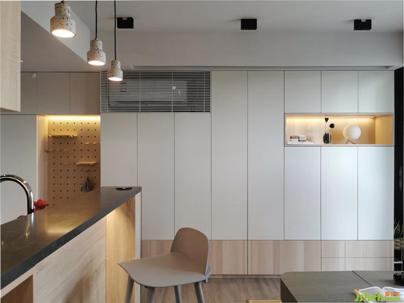 6、客廳和臥室的空調(diào)做隱藏設(shè)計(jì)處理,讓空間更加的美觀。此案的設(shè)計(jì)還有很多細(xì)節(jié),比如門口瓷磚和木地板的漸變過渡處理,方便清潔,還提升美感。吧臺的電動(dòng)升降插座,支持無線藍(lán)牙充電。陽臺為貓?jiān)O(shè)計(jì)的廁所等。