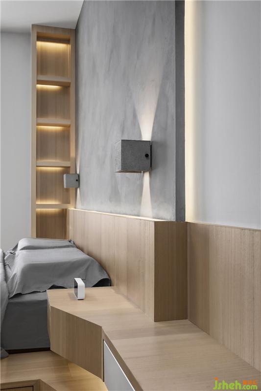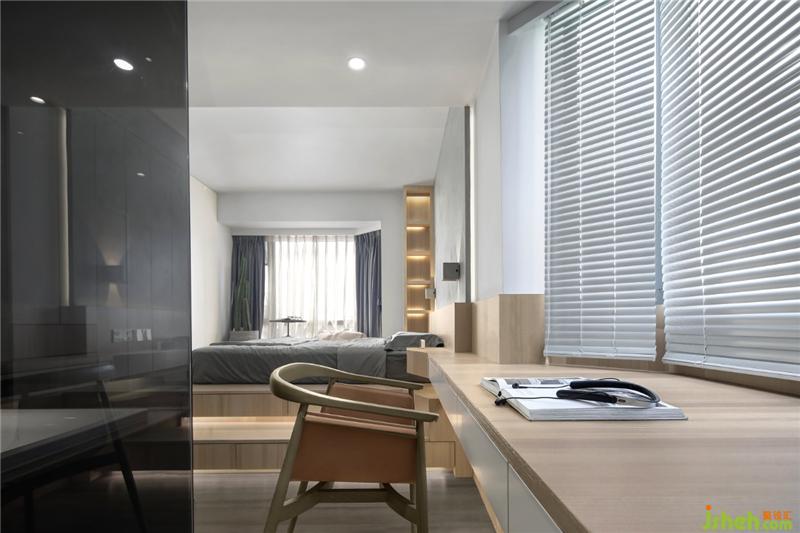 ▲床頭柜和書桌做連體的設(shè)計,臥室和書房的連接更協(xié)調(diào)。