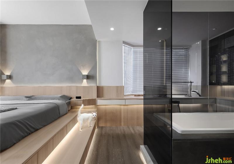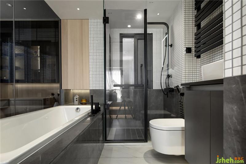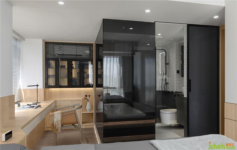 衛(wèi)生間作為一個獨立的盒子設(shè)計,打破傳統(tǒng)的隔墻,改為黑色玻璃,強(qiáng)化區(qū)域界線的同時,也提供了視線交流的可能性,不同空間呈現(xiàn)出不同的生活情境,且能夠視線無遮擋的交流溝通。半通透的黑色玻璃,方便清潔的同時,讓衛(wèi)生間增加了一絲神秘感和情趣!