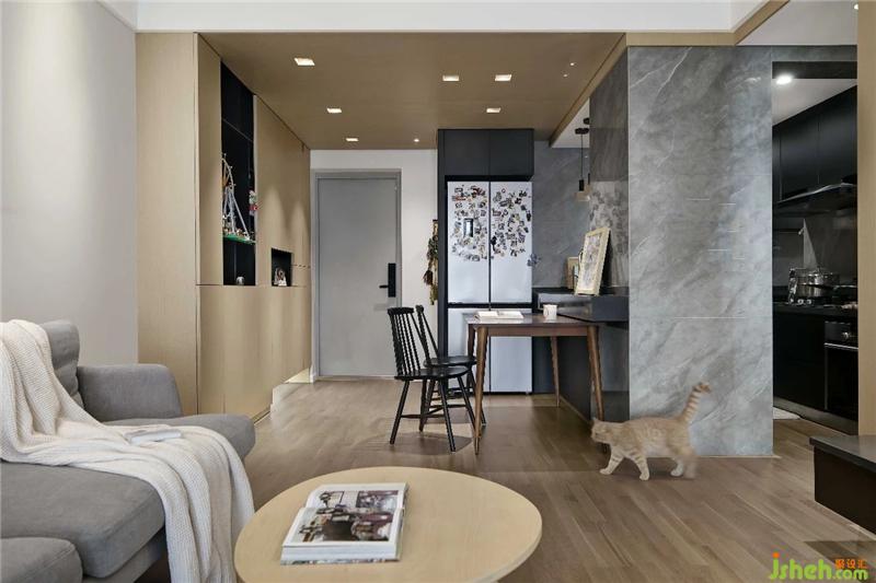 “MUJI”是整個空間的風格定調(diào),整個空間圍繞開放式廚房吧臺來設計,廚房采用黑色色調(diào)來凸顯其重要性。全屋的實木地板,人和喵能夠肆意的游走其中,扔掉鞋的束縛,感受著光腳的那種親切。 室內(nèi)設計師