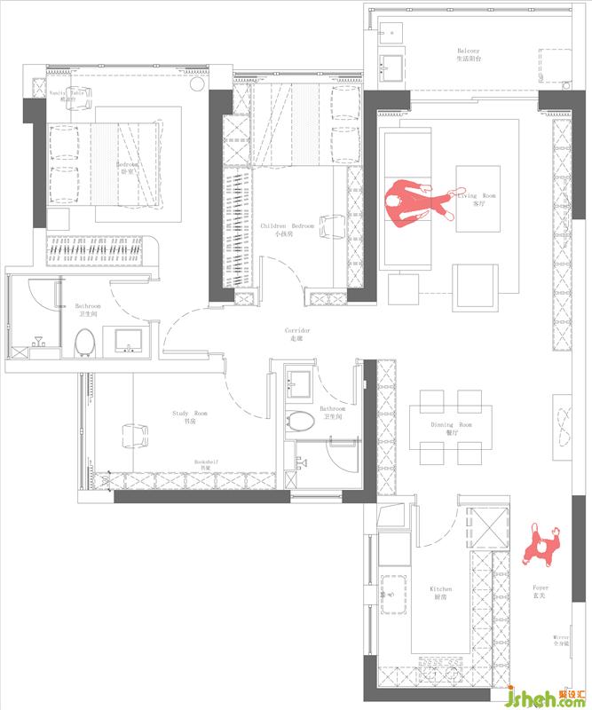 房主是一對(duì)新婚小夫婦,男主人從事軟件開(kāi)發(fā),平時(shí)喜好健身,為人謙和有禮,女主人有日本留學(xué)經(jīng)歷,喜愛(ài)日式文化,喜歡日料,音樂(lè),烹飪,旅游,偏愛(ài)溫暖的顏色,就像她給人的感覺(jué)那樣,如沐春風(fēng)。本案圍繞胭脂紅為主題展開(kāi)聯(lián)想——粉黛輕點(diǎn)胭脂紅,似水一笑月朦朧,三房?jī)蓮d里,迷蒙馬背眠,月隨殘夢(mèng)天邊遠(yuǎn),淡淡起茶煙。室內(nèi)設(shè)計(jì)師