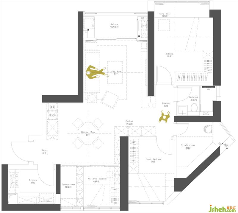需要思考的點很多,廚房狹小,大冰箱考慮其他空間?餐廳位置相對封閉,不是很通透,能否有優(yōu)化處理的可能?兒童房和儲藏室都比較小,能做到兩者都兼顧擴大嗎?