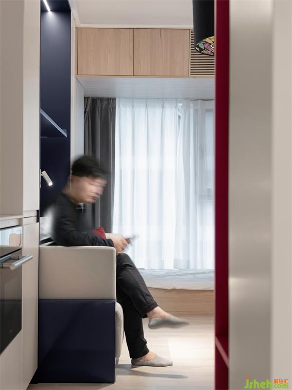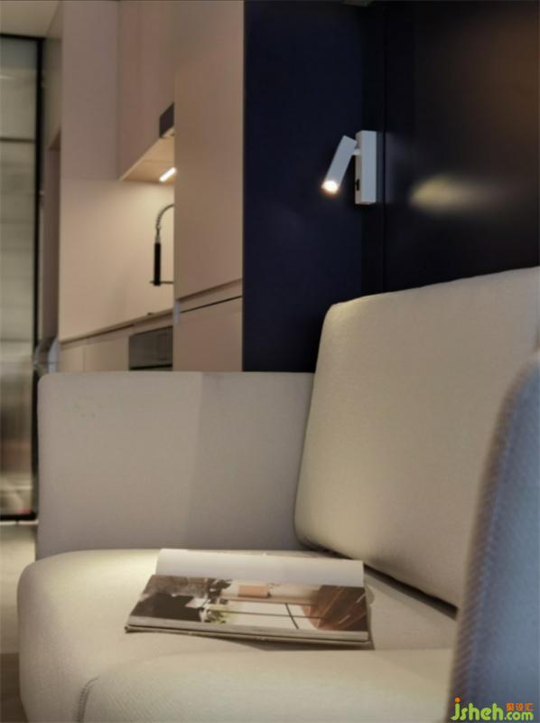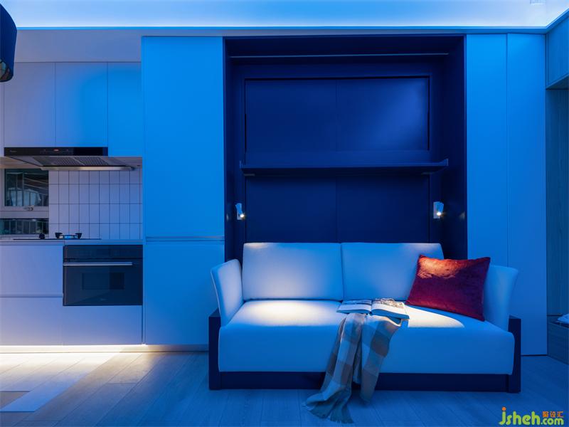 沙發(fā)邊上設(shè)計了可調(diào)角度小壁燈,折疊床翻下來,壁燈就可以當(dāng)做床頭閱讀燈使用