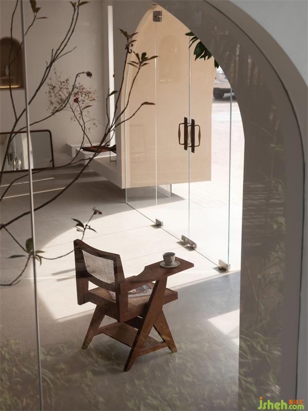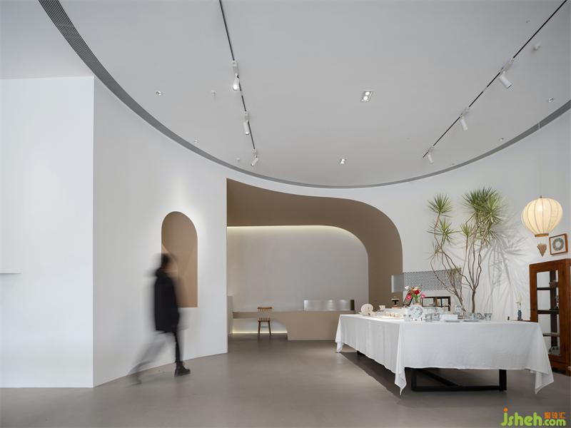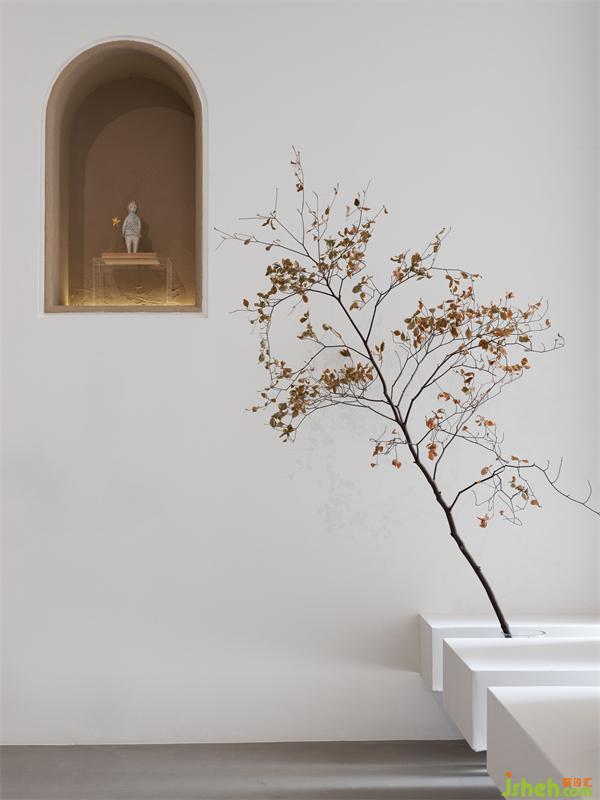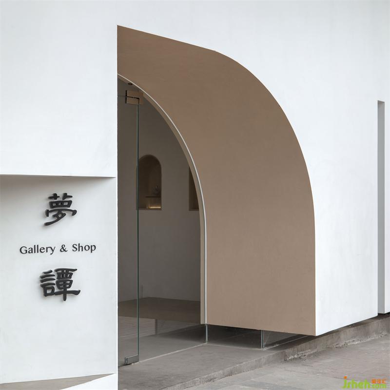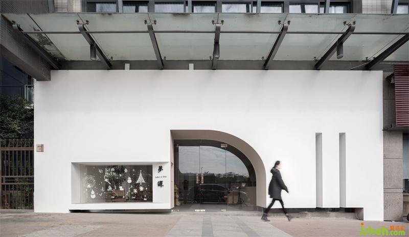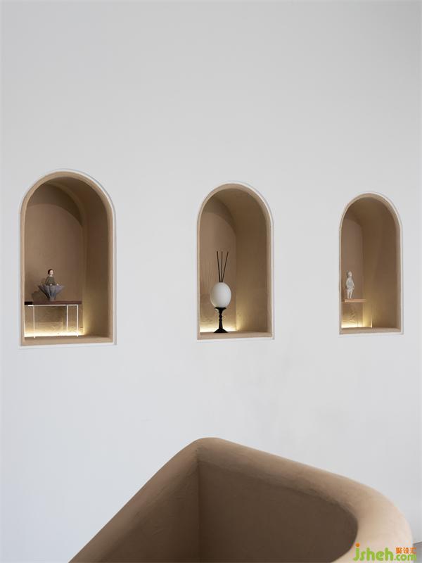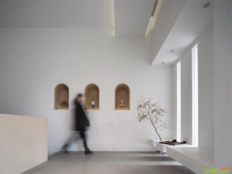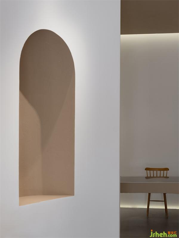 外立面運(yùn)用點(diǎn)線面構(gòu)成呈現(xiàn)出來(lái),強(qiáng)化構(gòu)成感。入口門洞用半弧形的造型,如器物式空間的壺口,白色的墻面和渾厚的門洞形成對(duì)比,讓入口增加儀式感。半弧形的光影倒映在地面,像是開啟的門扇,引導(dǎo)著參觀的人們進(jìn)入。