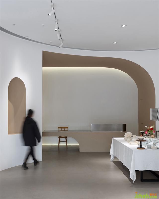 前臺(tái)區(qū)通過(guò)半弧形線條塑造一個(gè)持續(xù)變化的柔軟漩渦空間,似如瓷器的截面,也像優(yōu)美的身體曲線,米色的涂料顏色,讓空間多了層圍合感。墻面的燈帶,讓厚重的天花輕巧許多,同時(shí)區(qū)分不同體塊空間的界限。