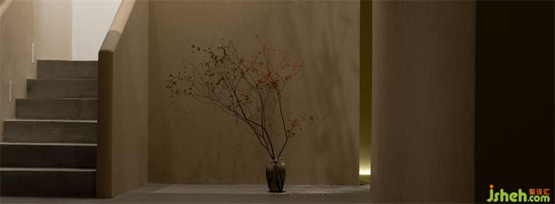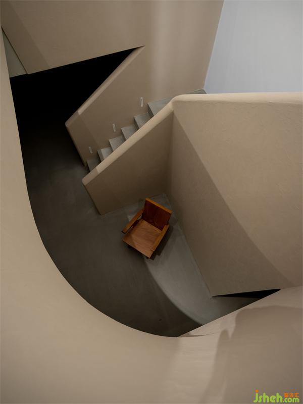 米色的半弧形樓梯延伸到負一層空間,粗糙的表面讓空間多了一絲的樸素和神秘感。負一層主要是作為畫廊展示空間,整體氛圍設(shè)計為偏暖色調(diào)的暗空間,墻面和天花沒有作過多的裝飾,通過米色藝術(shù)肌理涂料,使空間呈現(xiàn)出原始的質(zhì)感。