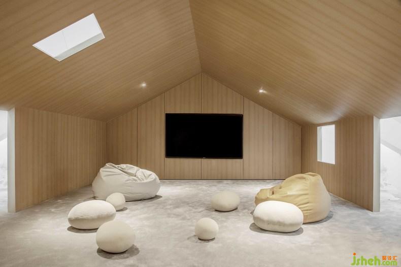 休息區(qū)以沉靜的灰色細(xì)部和輕柔的線條營(yíng)造安靜的氛圍,轟趴民宿設(shè)計(jì)讓不希望被打擾的人盡可能地放松身心。逃離了城市的喧鬧,生活的壓力,設(shè)計(jì)師有意引導(dǎo)人們把節(jié)奏放慢,在山野深處能將自己舒展開(kāi)來(lái),返璞歸真,為心靈提供庇護(hù)港灣。