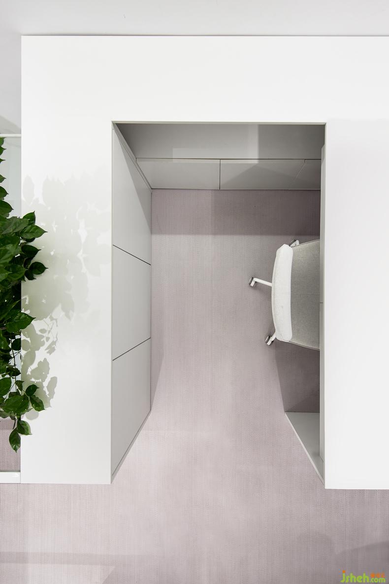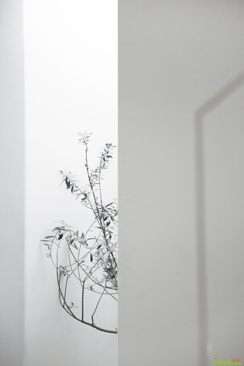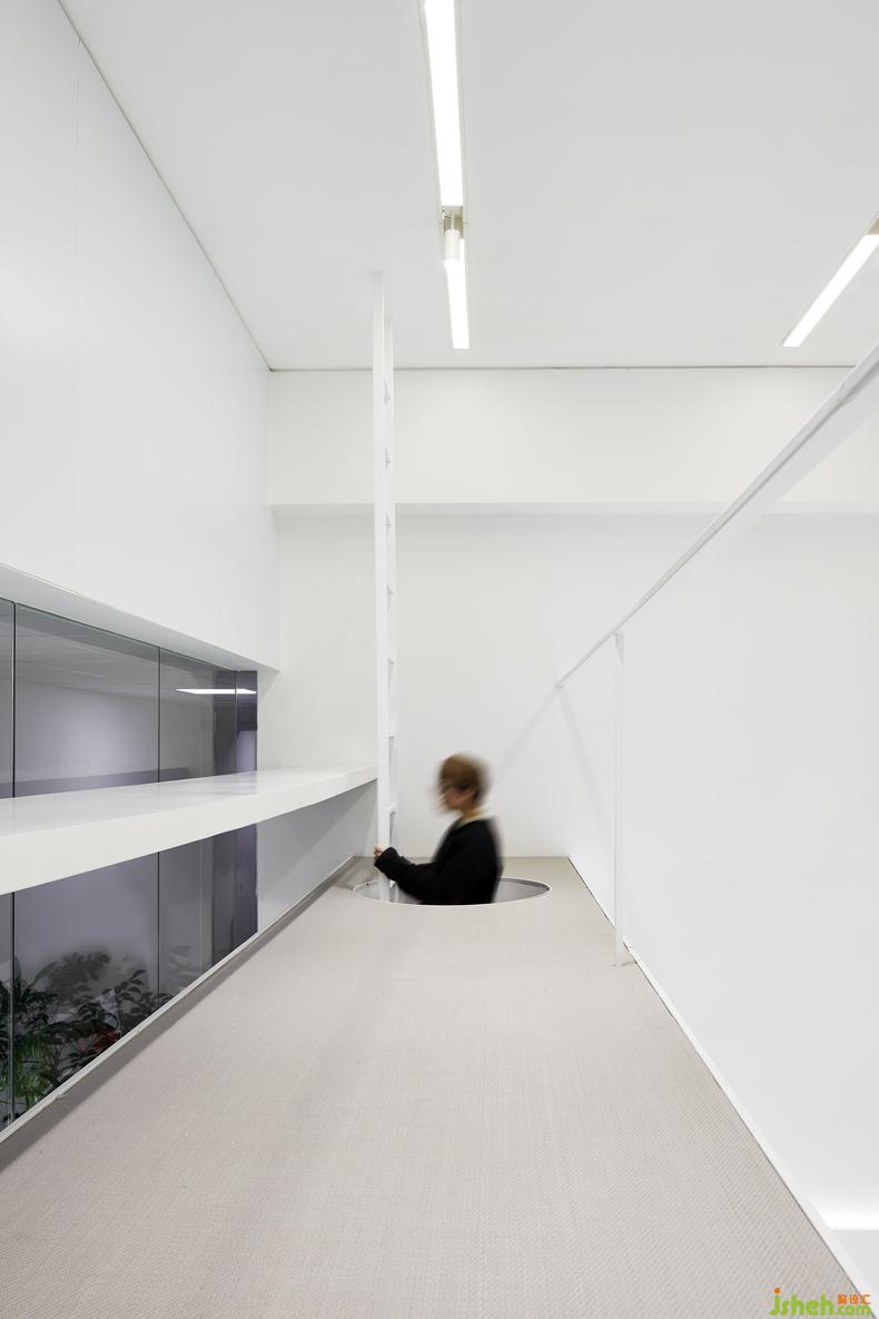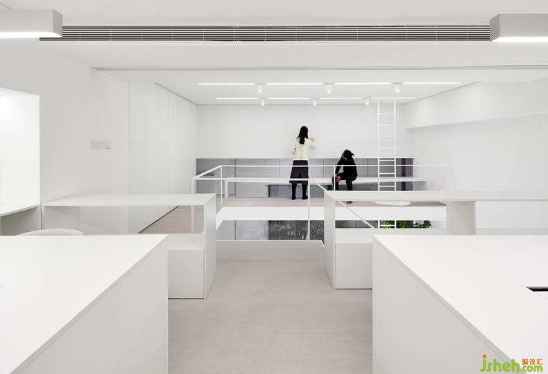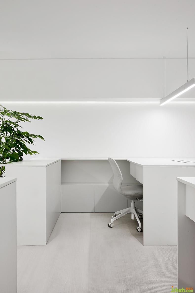 白色的空間有利于工作的專注,二樓的辦公室為設(shè)計師們準(zhǔn)備的寬闊的一體化的工作臺。辦公改造設(shè)計定制的共享桌面便于從單人工作轉(zhuǎn)向團(tuán)隊合作。各種線路則被隱藏在桌子的內(nèi)部。工作儲存單元沿著辦公室的側(cè)墻分布開來,足以容納所有人的物品。一層高大的植物透過微小的中庭長到二樓,使得一二層在垂直方向多了更多交流,同時也將二樓的大工作區(qū)自然的分為兩個單元。