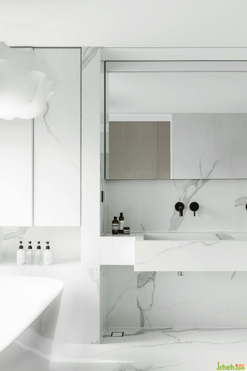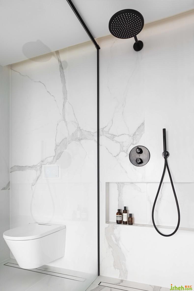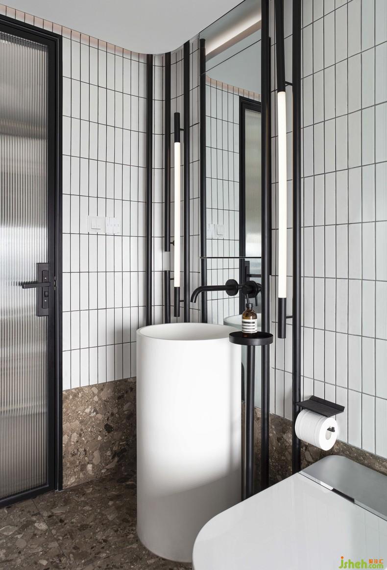 黑色金屬直線條作為這個(gè)空間搭配的重要元素,裝修設(shè)計(jì)其代表的「點(diǎn)」「線」「面」對比魚肚白大理石包裹的墻體、洗手臺代表的「體」,形成很好的層次和對比。