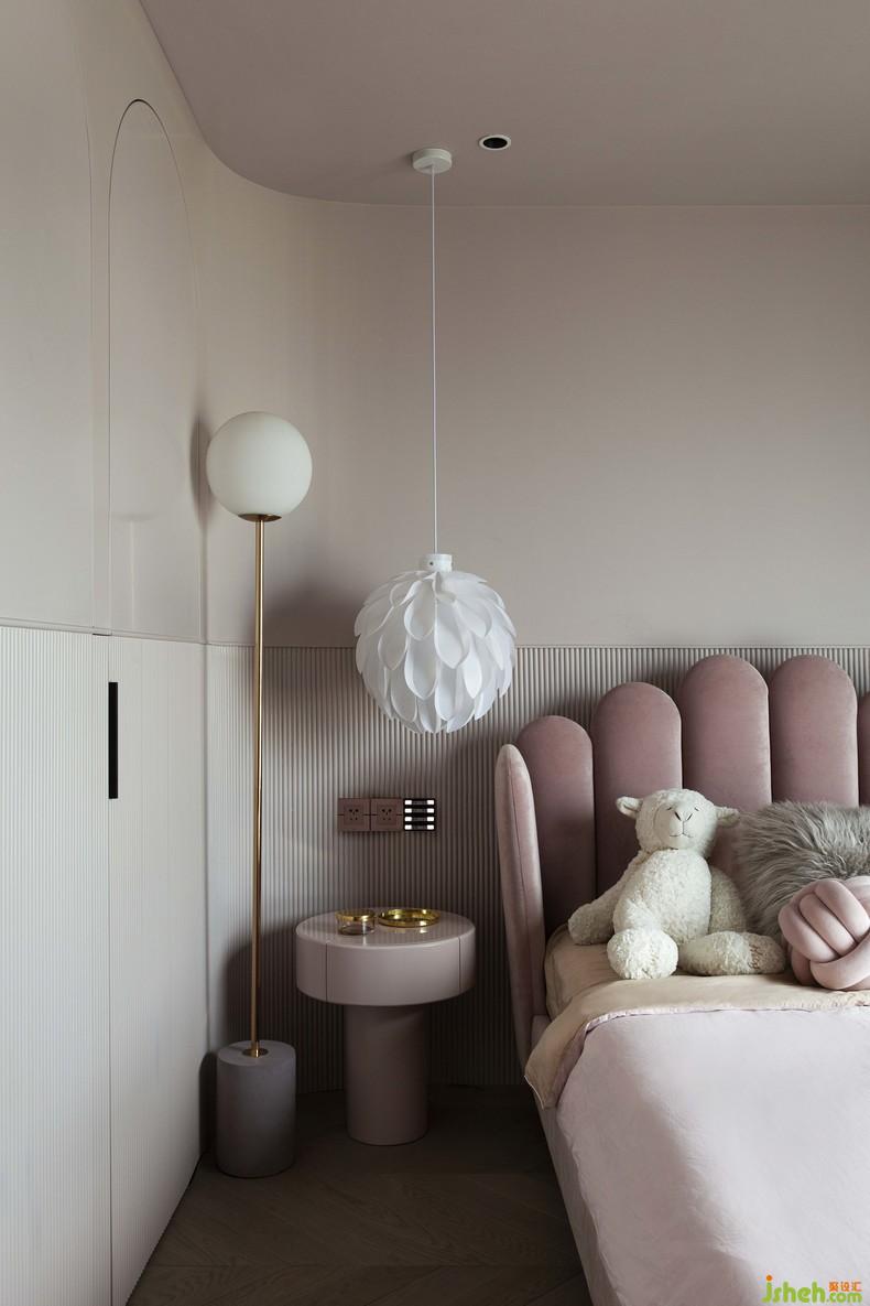 充滿生機(jī)與活力的空間是為孩子們而準(zhǔn)備的。裝修設(shè)計(jì)在女孩房,粉色的墻依然扮演著不可或缺的角色。設(shè)計(jì)師避免了高飽和度的粉,用了低飽和度的“臟臟”粉,它對孩子們溫柔地訴說著空間的柔軟氛圍。不同燈具的組合和開啟方式還可以反映出早晚房間里的有趣變化。
