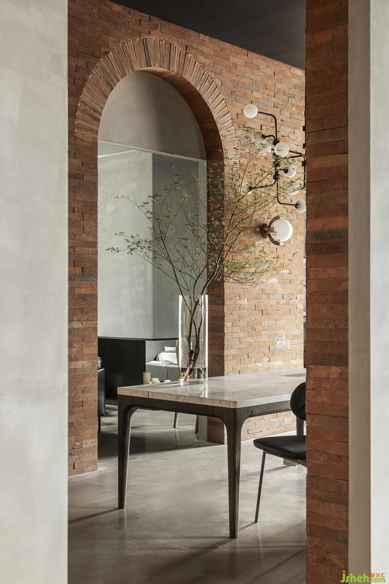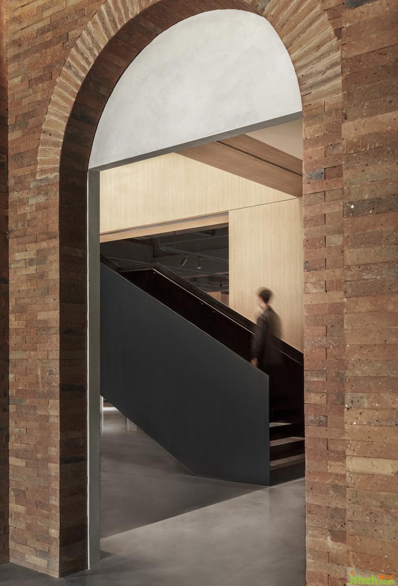 設(shè)計(jì)師將建筑立面完整地保留下來(lái),并將標(biāo)志性的記憶感受延伸到室內(nèi),入口前廳使用與外立面呼應(yīng)的紅磚與拱形元素,將新舊兩種材料通過(guò)“拱窗”與“門(mén)”的比例與形式感聯(lián)結(jié)。