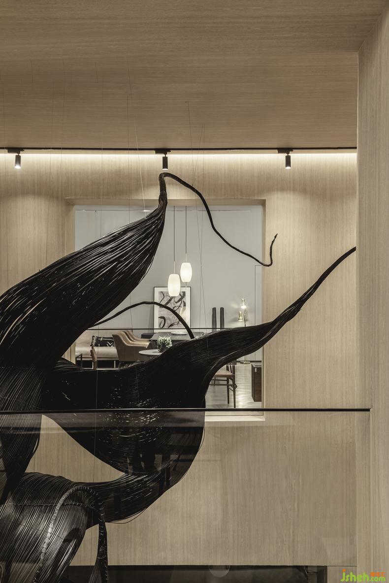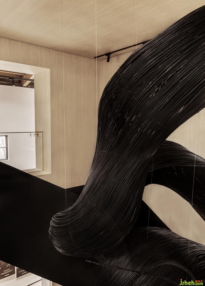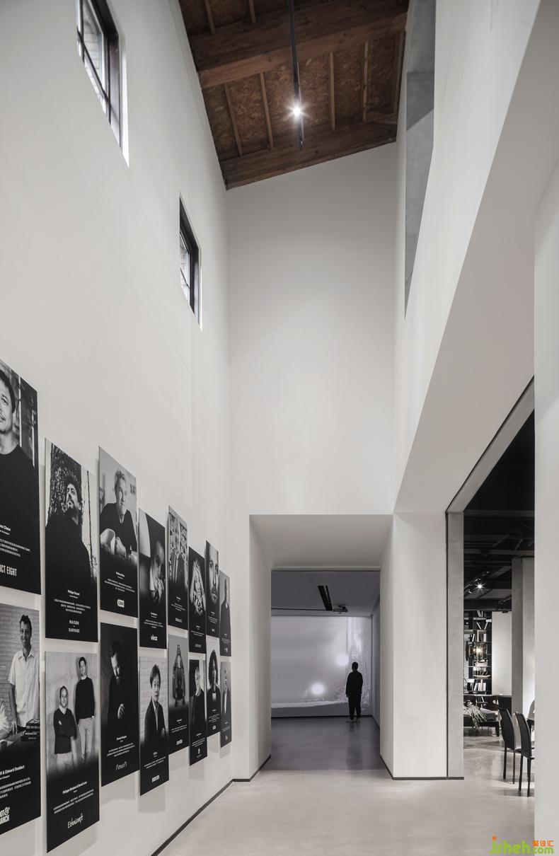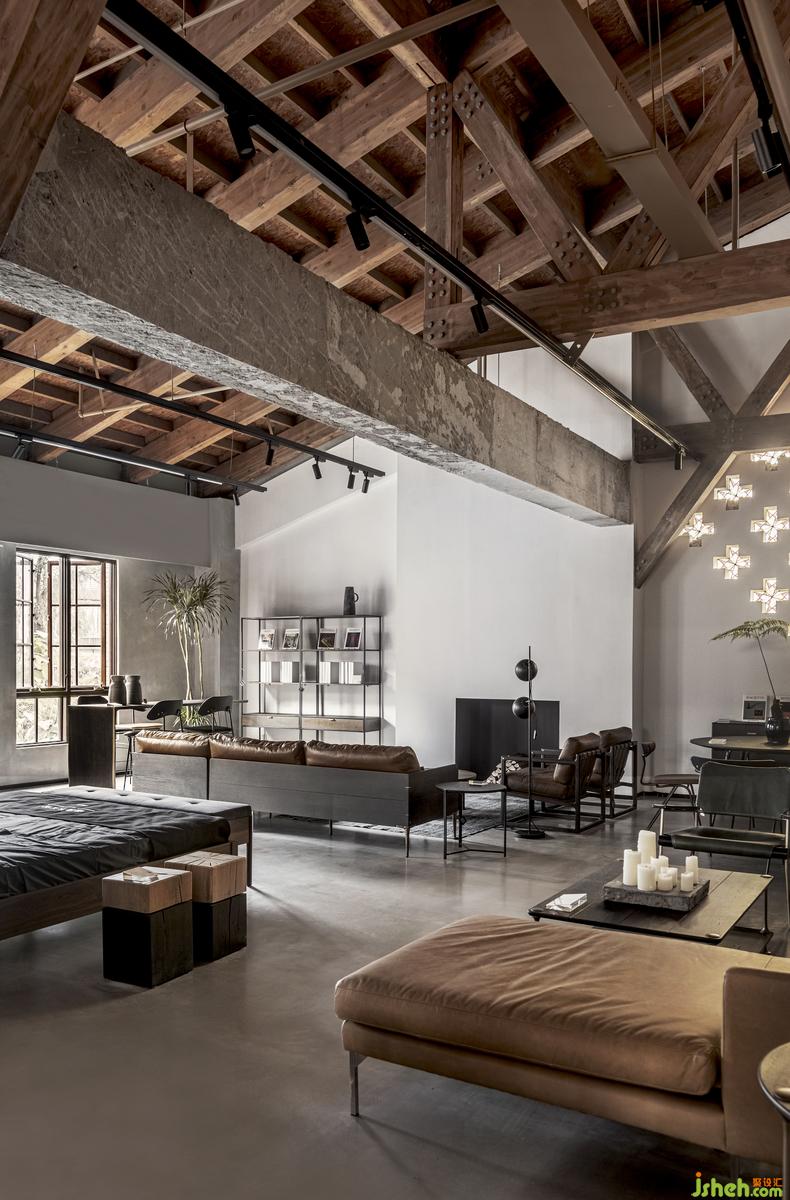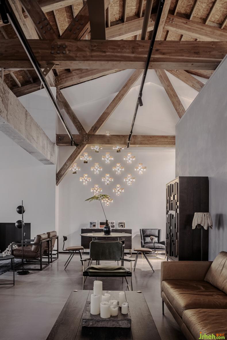 現(xiàn)代風(fēng)格的家居展示空間與經(jīng)過保護(hù)修復(fù)的桁架結(jié)構(gòu)并存并形成強烈視覺沖擊。展廳設(shè)計家居的色澤質(zhì)感與桁架木色相呼應(yīng),光感的暗示使大跨度空間變得親切。通過將材料質(zhì)感與顏色關(guān)聯(lián),體現(xiàn)新與舊的融合,讓整棟建筑擁有和諧統(tǒng)一的視覺感和空間感。