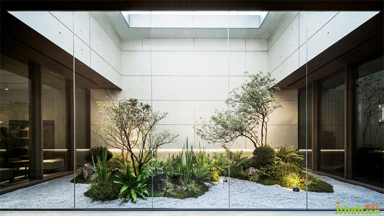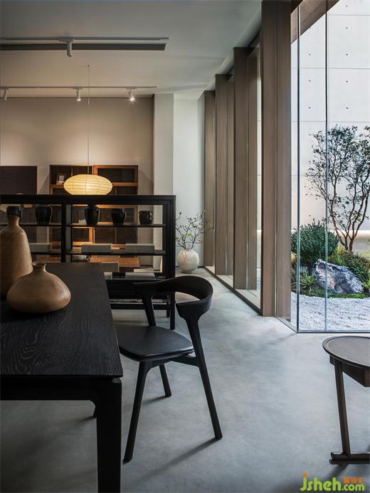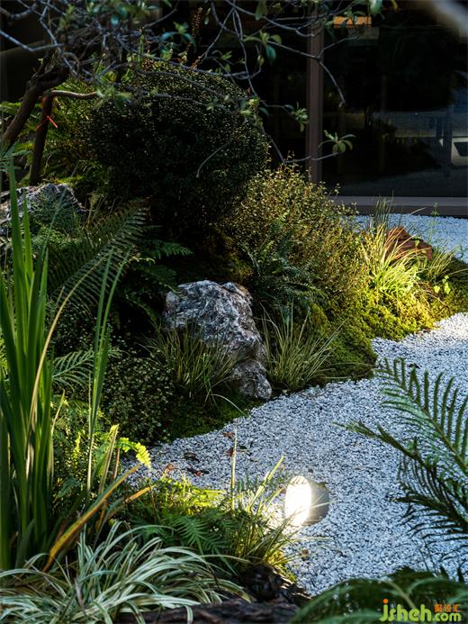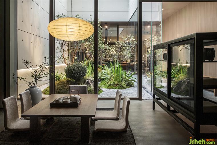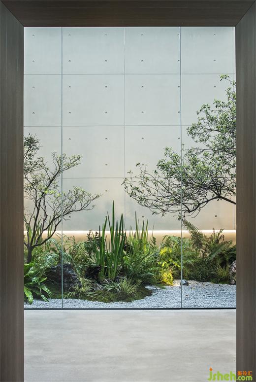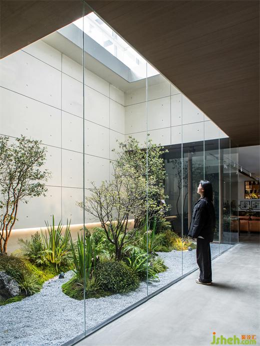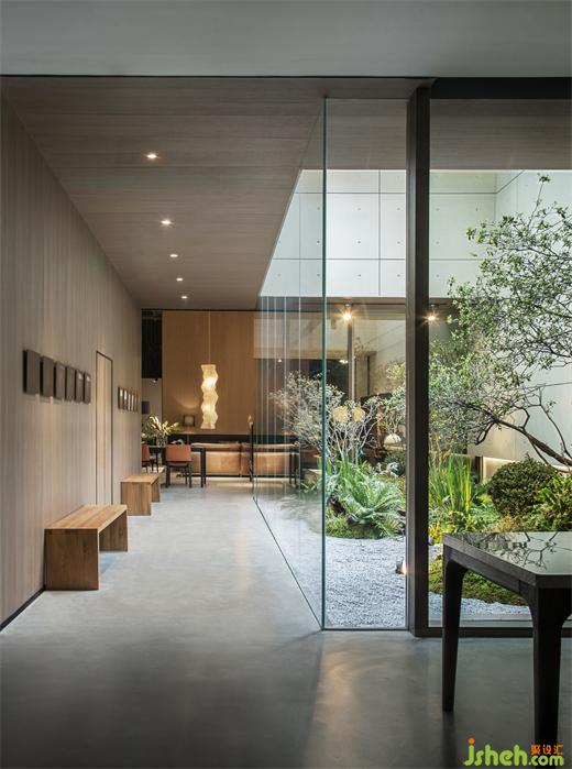 多個(gè)空間圍繞同一處景觀不同的取景方式,暗示了不同空間及其中家居各異的風(fēng)格調(diào)性。為了使室內(nèi)空間均質(zhì)化,目心設(shè)計(jì)在不同風(fēng)格房間中使用一致的材料來(lái)營(yíng)造出純粹的空間氛圍。為了消除現(xiàn)代混凝土帶來(lái)的冰冷感,設(shè)計(jì)師利用燈光散發(fā)出柔和協(xié)調(diào)的光芒,呼應(yīng)了空間氛圍。