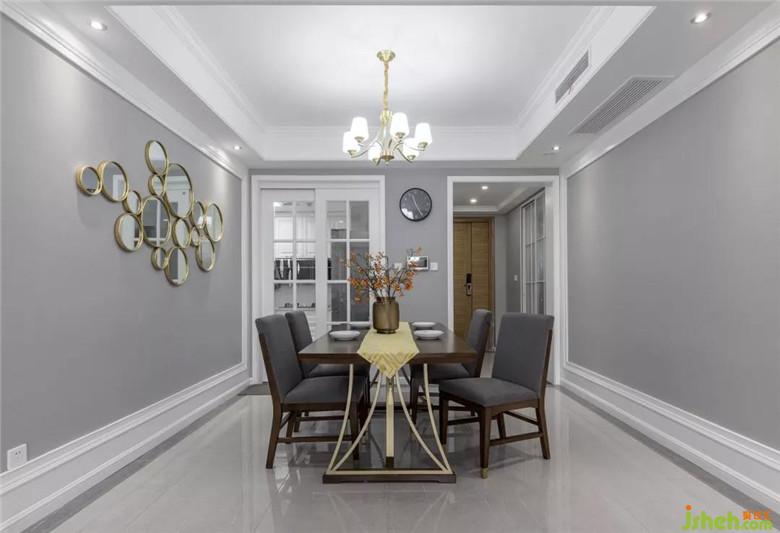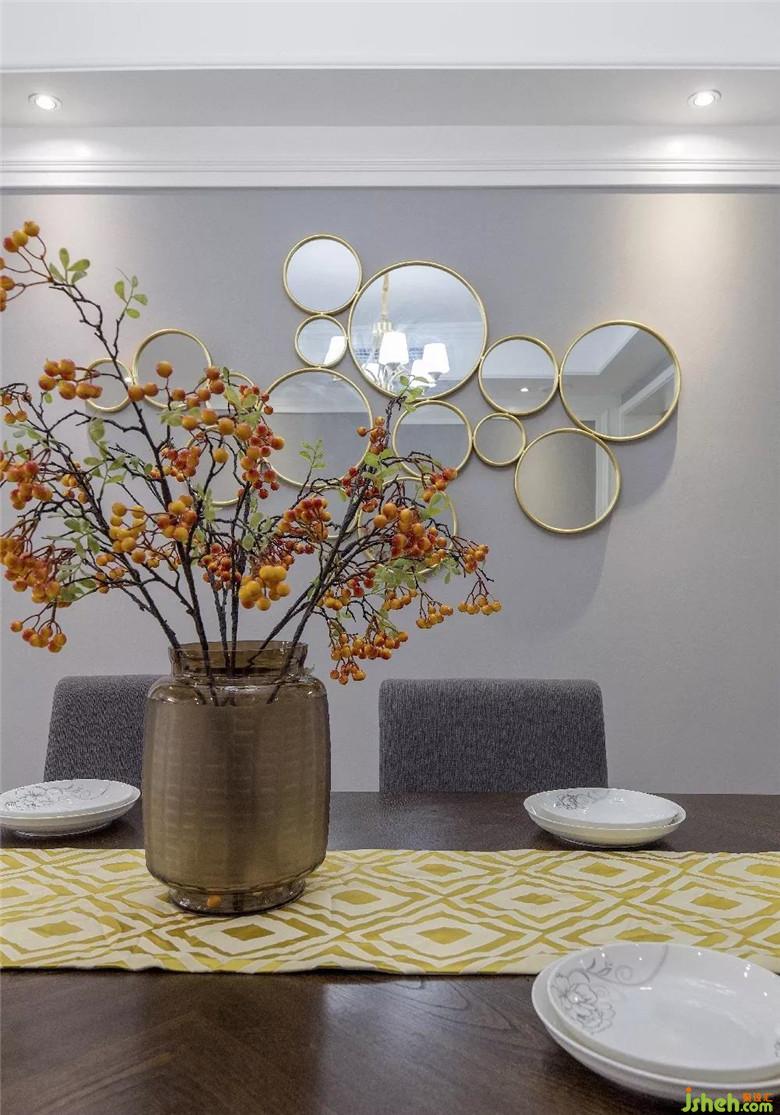 客廳和餐廳,都是深色的家具,墻面選擇不同的裝飾品,掛畫比較溫馨、鏡面比較時尚,視覺上給人一種獨特的美感,像一個天平,對家人的愛從不偏袒。
