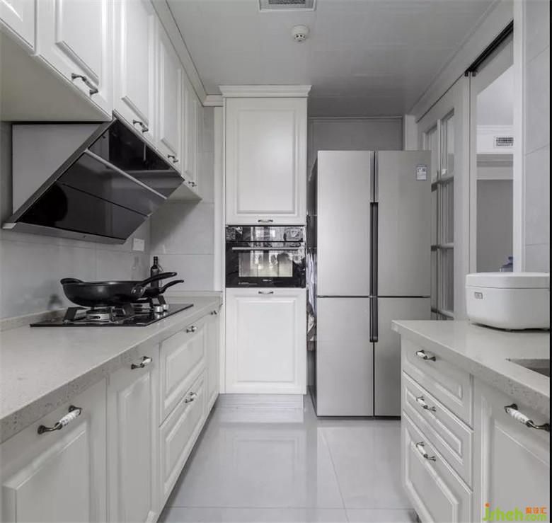 白色櫥柜、淺色瓷磚,身在其中,讓人心里都暖了起來(lái)。上下櫥柜的設(shè)計(jì),讓物品分門別類擺放,干凈的廚房也會(huì)讓做飯人的心情變的舒暢,滿溢著溫馨之香。