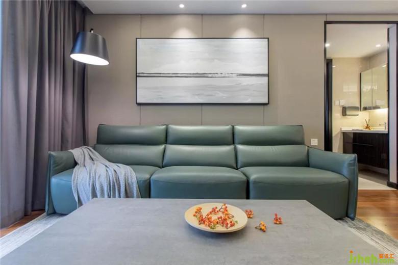 沙發(fā)背景墻,做了一個(gè)咖色的軟包,進(jìn)入衛(wèi)生間的空間本來(lái)沒(méi)有門的,用細(xì)邊黑框做了一個(gè)假門套,與掛畫、衛(wèi)生間盥洗柜都更搭。