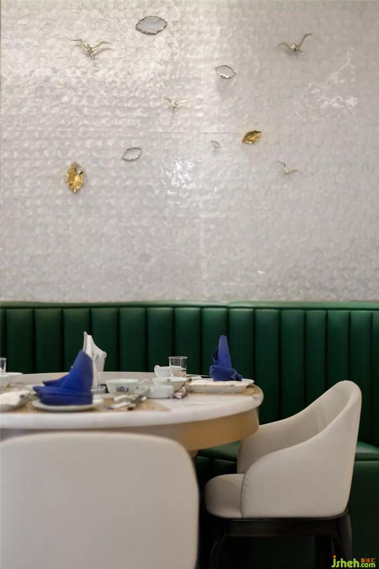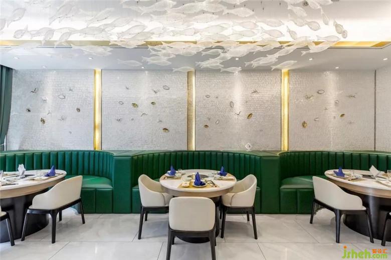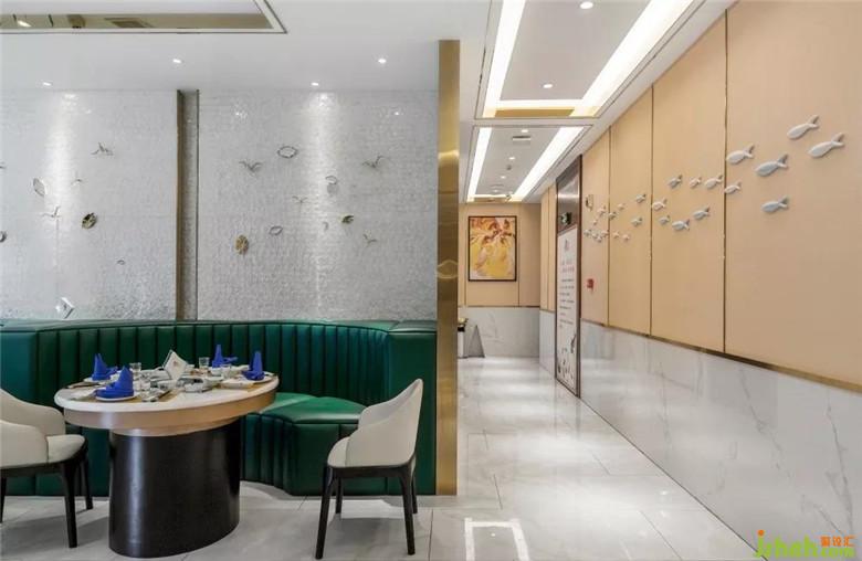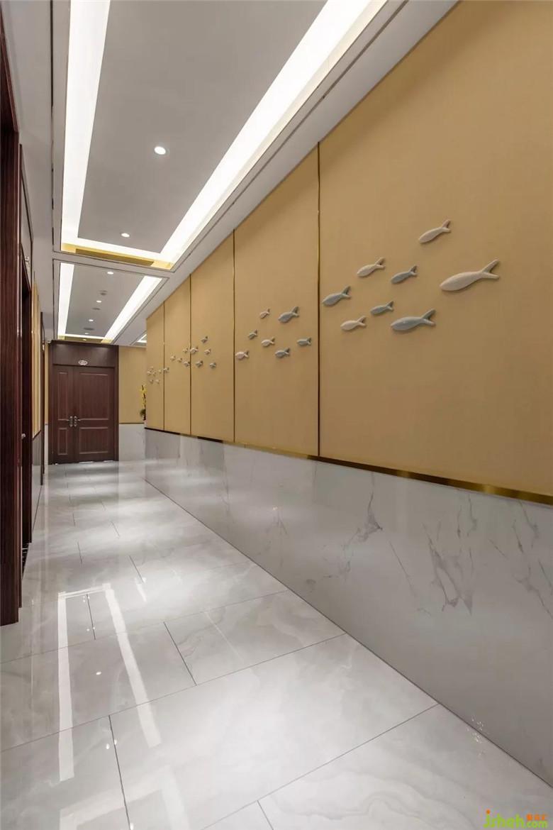 整個(gè)空間都貫穿著“魚(yú)”的元素,為此特意從廣東定制了“魚(yú)型”水晶吊燈,組成一個(gè)大的“魚(yú)型”做在大廳,在大廳墻面也專(zhuān)門(mén)從廣東定制了3mm的貝殼板,讓整個(gè)大廳顯得更有海洋的氣息。