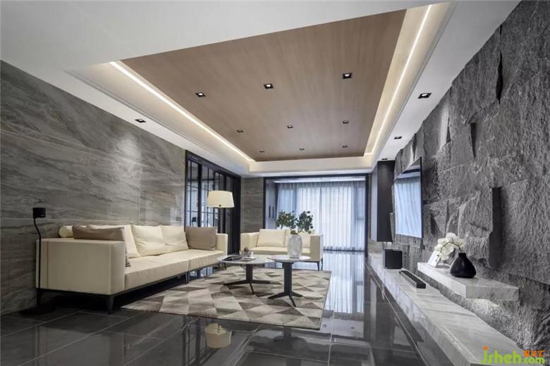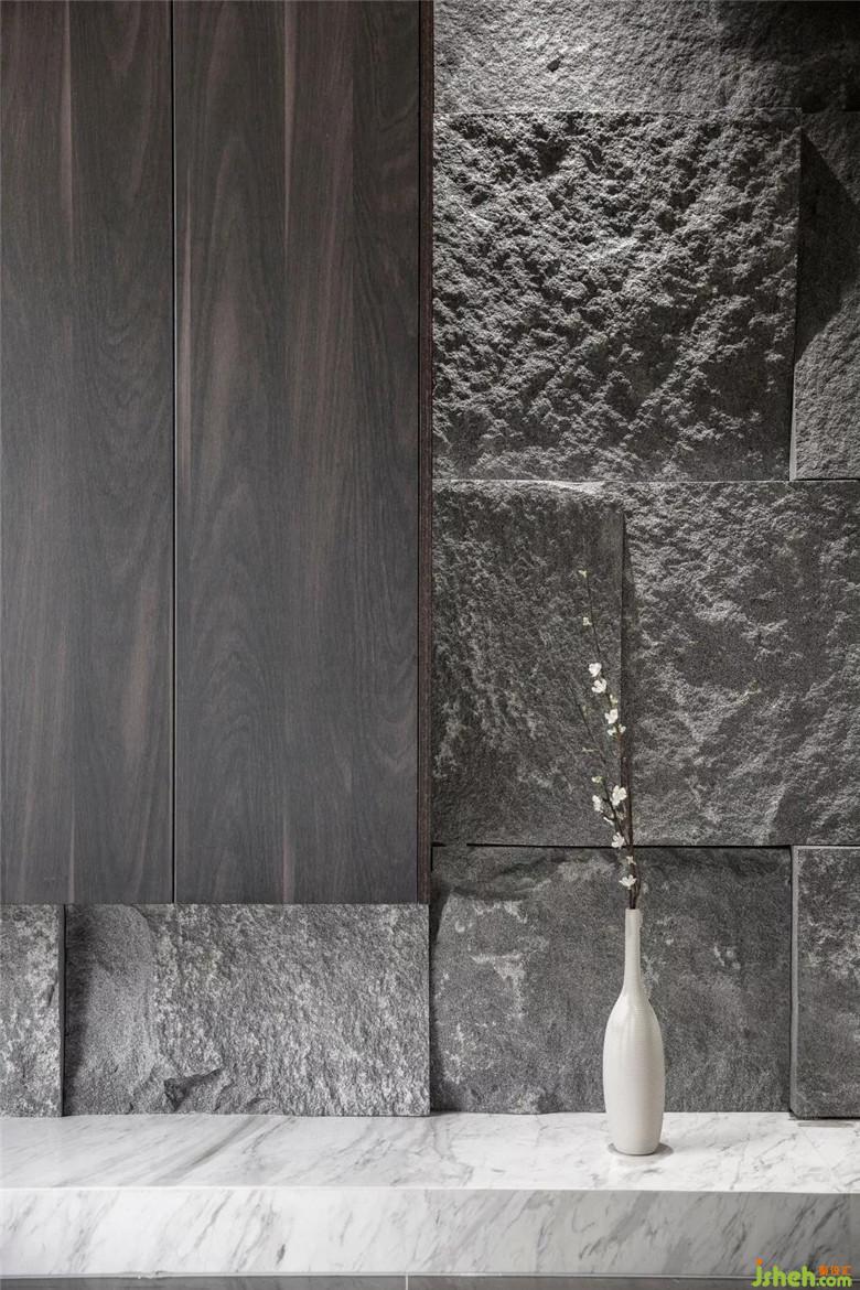 沙發(fā)背景墻900X1800的超大亮光磚,與粗山石的電視背景墻輝映,整體色調(diào)柔和。反射出的環(huán)境色微微透著光影,再附以大面積的木質(zhì)、天然材料,二者相容,猶如清潭水光映入地面。
