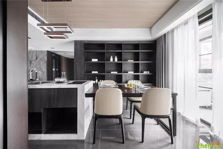 餐廚一體化,既可各自獨(dú)立,又可相互補(bǔ)充,從功能上達(dá)到最大化利用。餐廳拆除L型原墻處理為餐柜及酒柜,讓就餐區(qū)更為豐富。