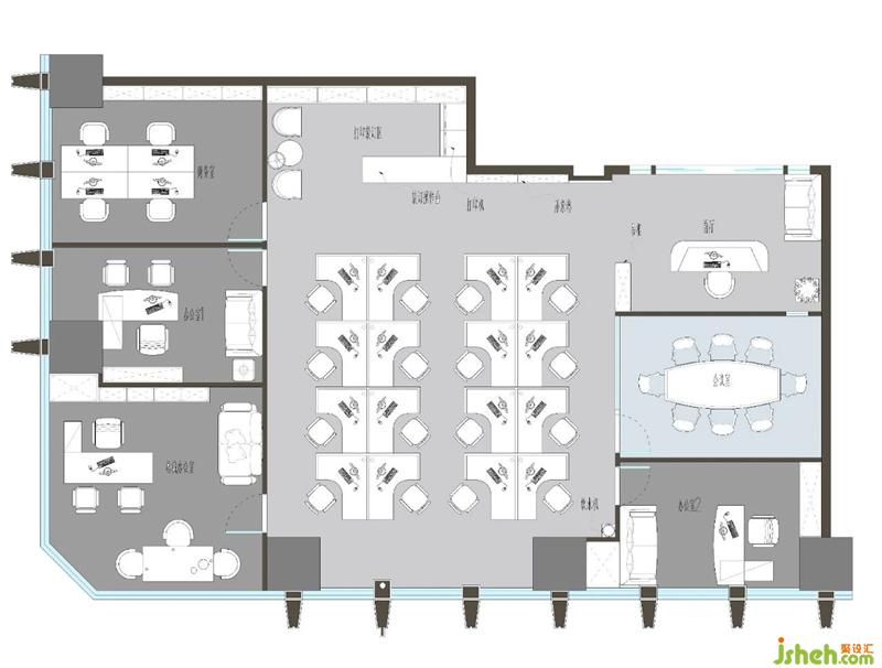 根據(jù)客戶需求,將原始戶型重新布局,規(guī)劃出了獨立辦公室、公共辦公區(qū)、財務(wù)室、會議室、打印裝訂區(qū)、休息區(qū)。本案中大量使用了白色乳膠漆、部分使用灰色及藍色色調(diào)乳膠漆,讓整個辦公空間盡顯干凈簡約。無窗會議室采用大面積落地玻璃與百葉窗,增加采光的同時也保證了私密性。