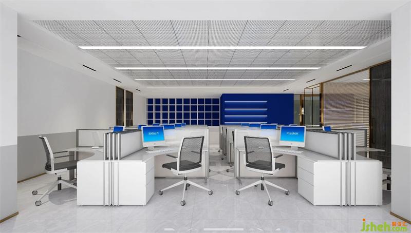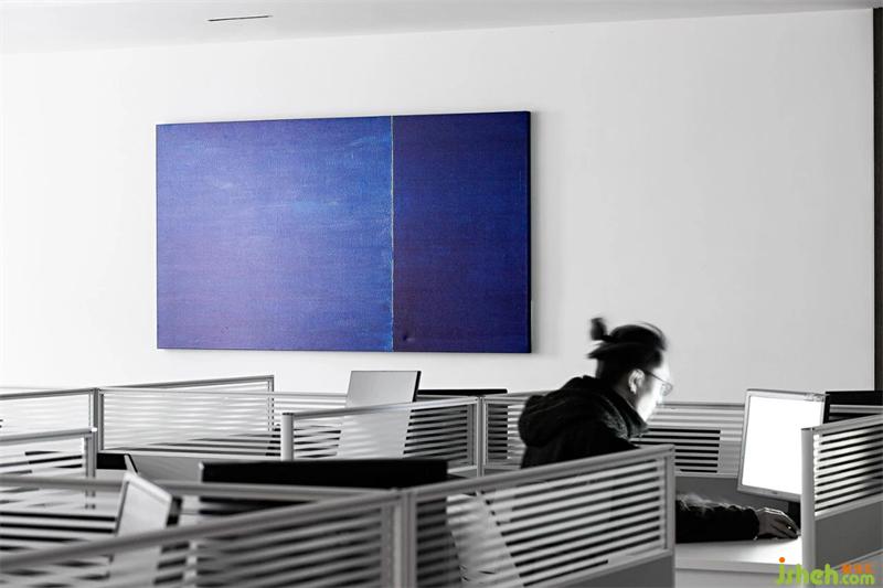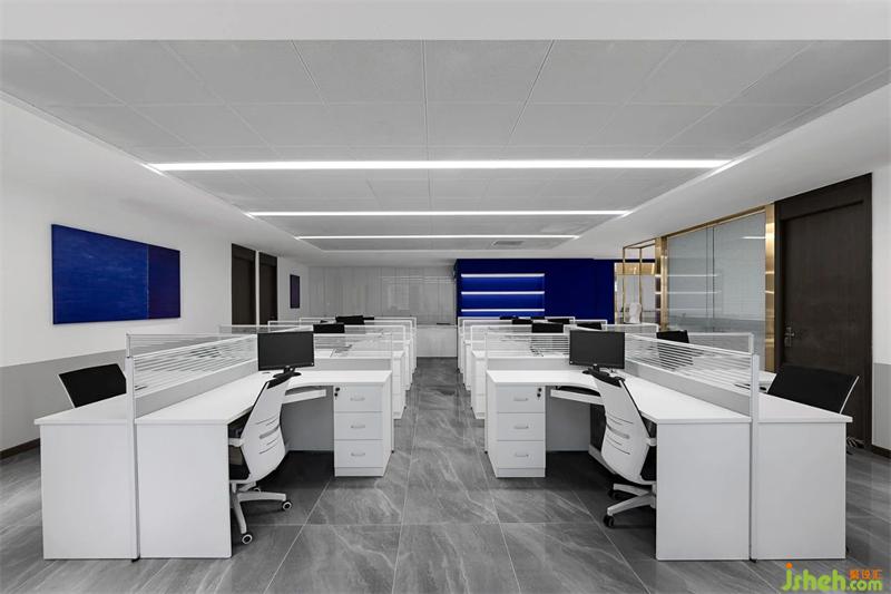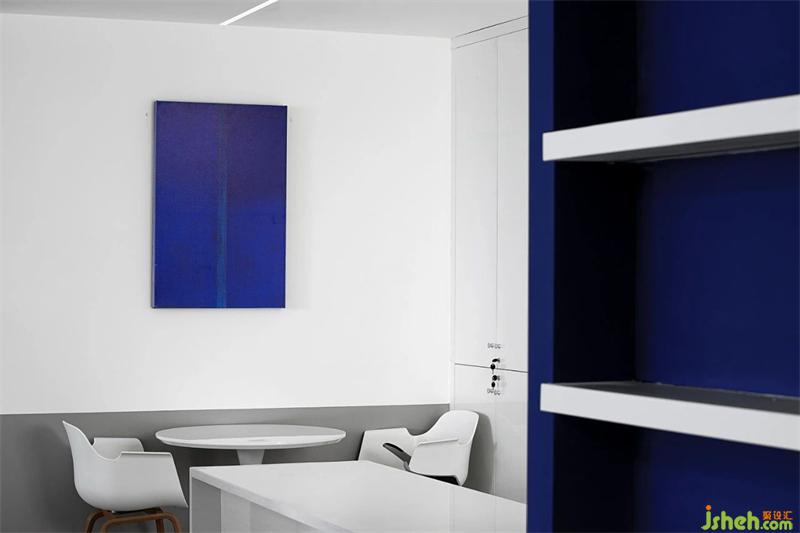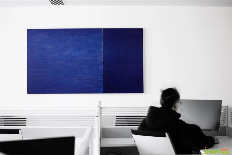設(shè)計師在進行動線推演后,以田字形貫穿整個空間,豐富使用動線,大家在這里自由的協(xié)作、交流和溝通。天花板吊頂?shù)膸缀畏涓C狀,延展了空間的呼吸感,左右聯(lián)通的一體式柔和燈帶,滿足辦公室燈光環(huán)境對人的情緒和心理感受,達到空間使用與觀感的平衡。與樸素配色形成對比的寶藍色系,辦公室設(shè)計以掛畫、墻面的形式點綴局部,既激發(fā)著身處該空間的使用者的創(chuàng)造力,催化著思維方式的自由與發(fā)散,又起到突出空間的作用。
