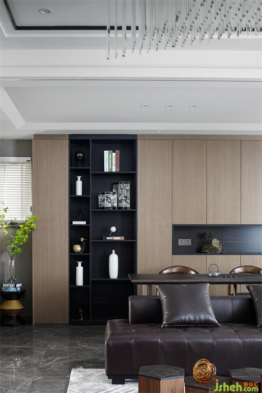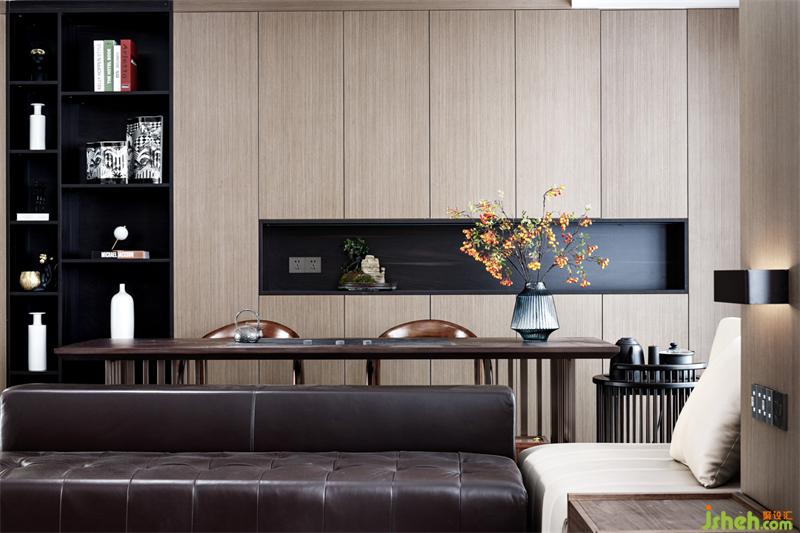 考慮家里老人爬樓不方便,一樓入戶靠右留有一個房間做老人房,離衛(wèi)生間也近。除去一個房間后,客廳的使用面積接近40㎡左右。我們在客廳的一邊設(shè)計了品茶區(qū),環(huán)繞型的布局思路,將空間尺度、功能及實(shí)用性無限延伸。