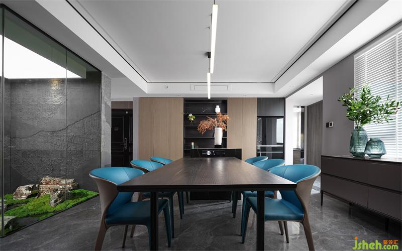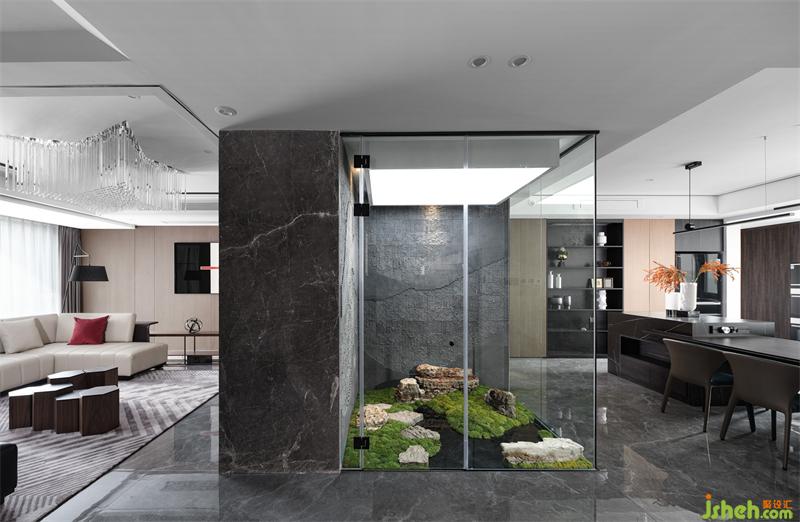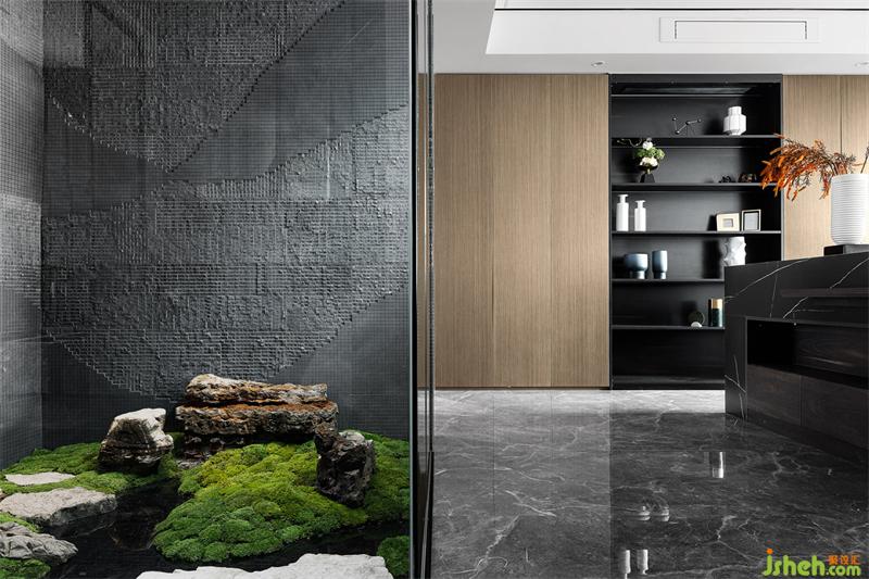 取消掉原玄關(guān)處的儲物間,連接客餐廳,使整個空間更加通透靈動。作為連接客餐廳的中心樞紐,我們選擇在此處造景,同時也解決了此處大方柱的突兀。原設(shè)計做了樹,因風(fēng)水原因改成了太湖石和烘干的苔蘚,綠意濃濃,生機(jī)勃勃。