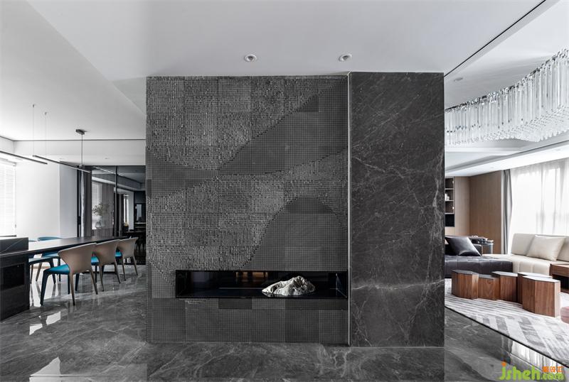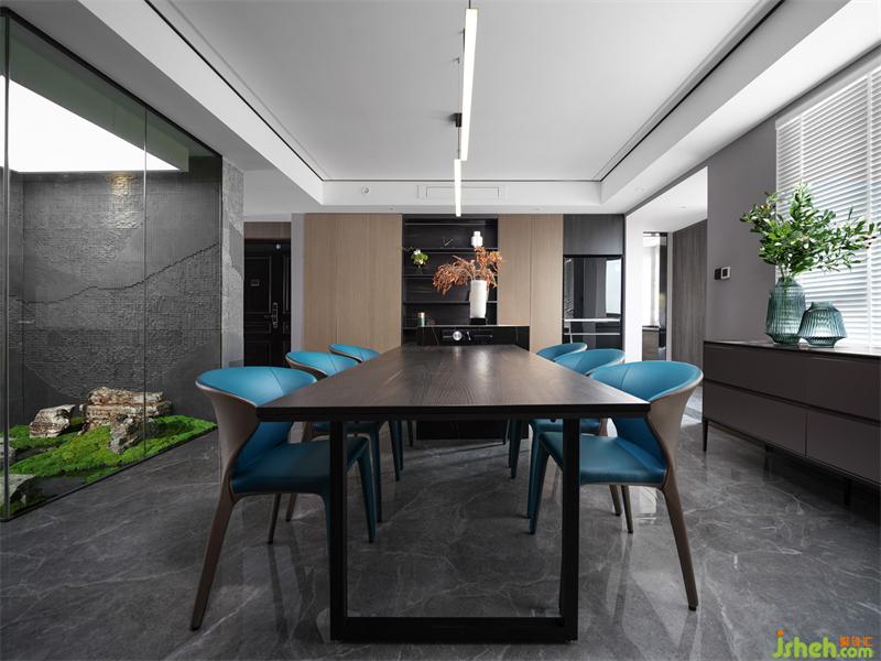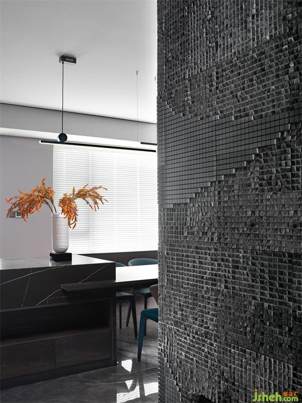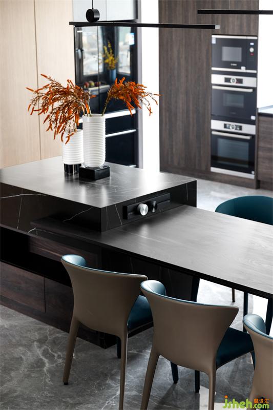 穿行至餐廳,西廚島臺和餐桌共為一體,展開在石影木色中,以自然的紋理、材質(zhì)、線性燈飾點(diǎn)綴修飾,呈現(xiàn)當(dāng)代空間功能整合、美學(xué)并敘的開放式格局。