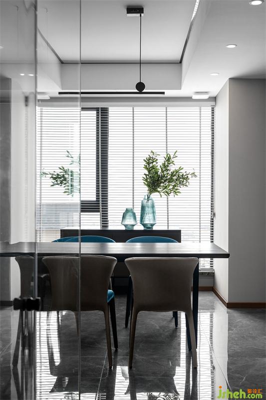 極簡灰風(fēng)格,可不止有黑白灰這么簡單,一些“大膽“的嘗試就能讓居室活躍起來。餐椅的跳躍的藍(lán)色,讓空間不再沉悶。長形大巖板餐桌+島臺的形式,可以容納多人就餐,也可以充當(dāng)手工區(qū)等。島臺上留有電源,可安裝內(nèi)嵌式電磁爐,可以做簡單的早餐及小吃??此坪唵蔚膸缀误w組合,既美觀又具有實(shí)用性。
